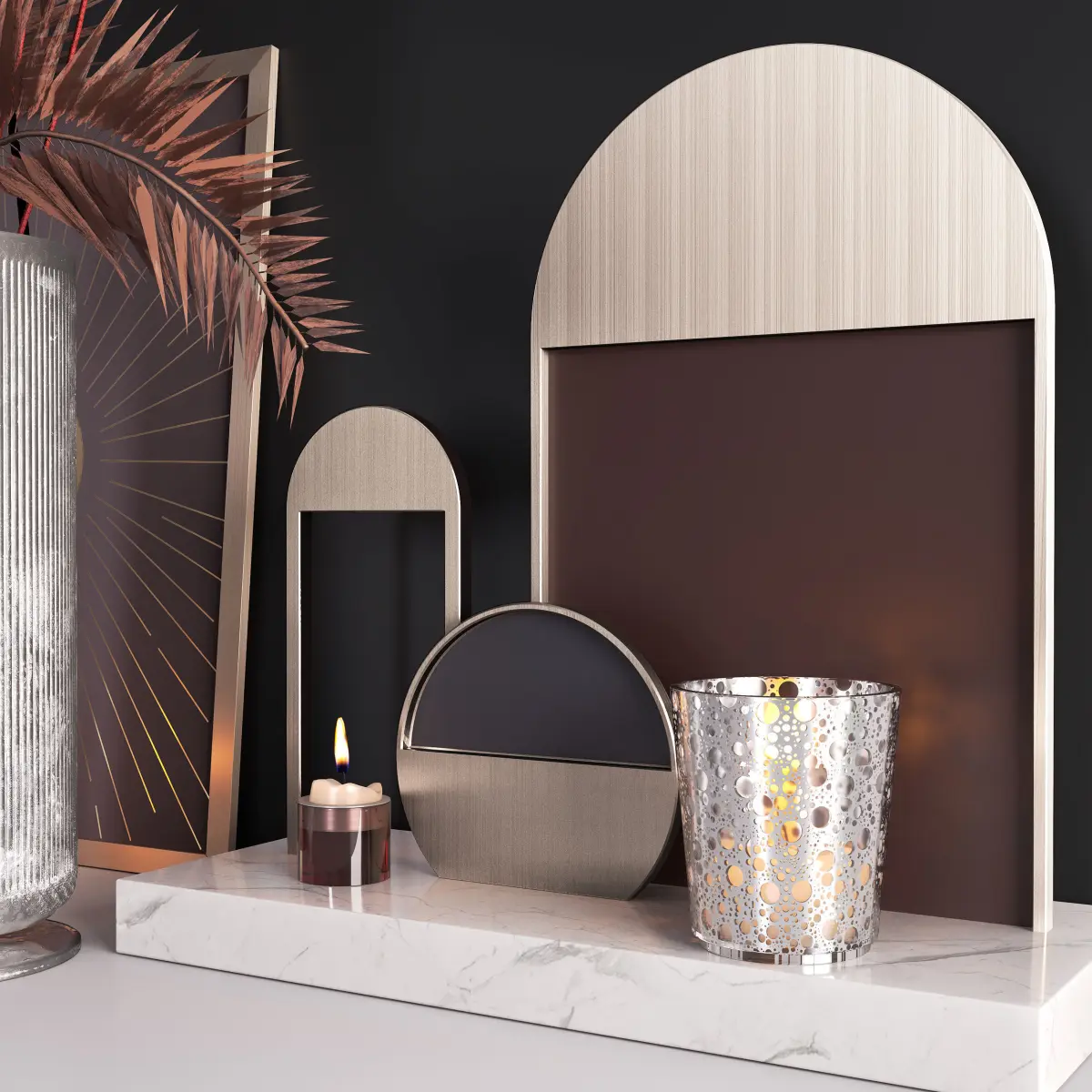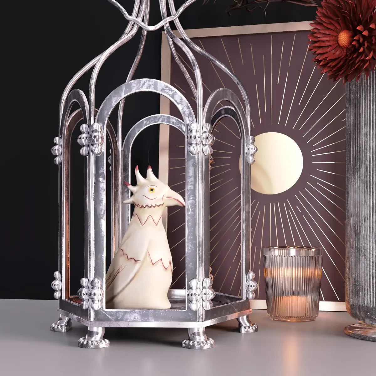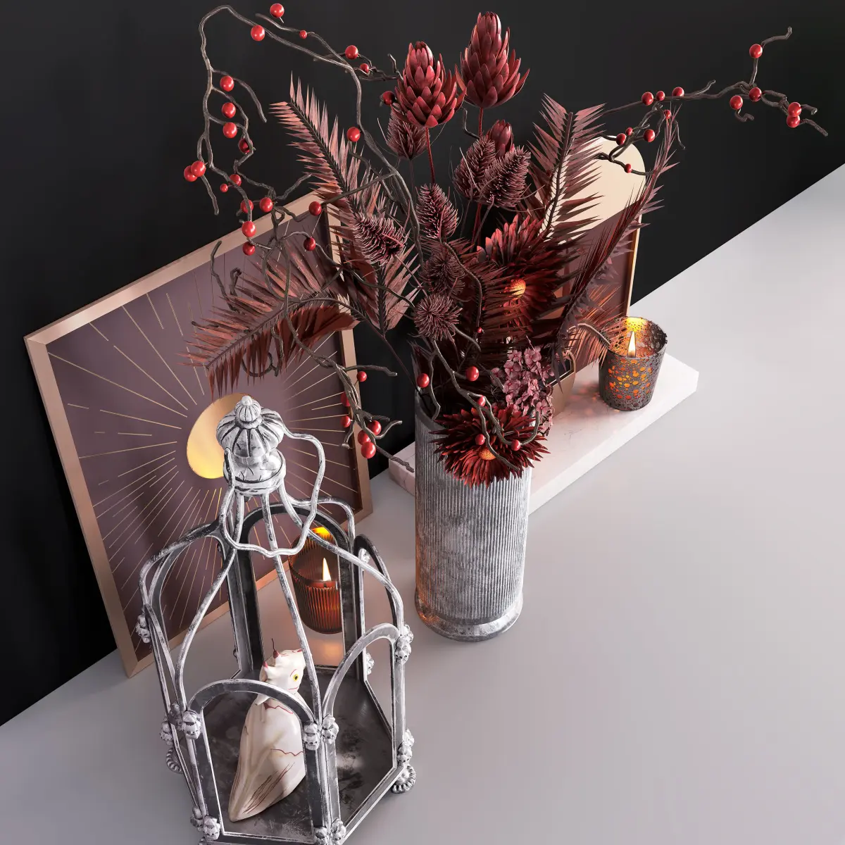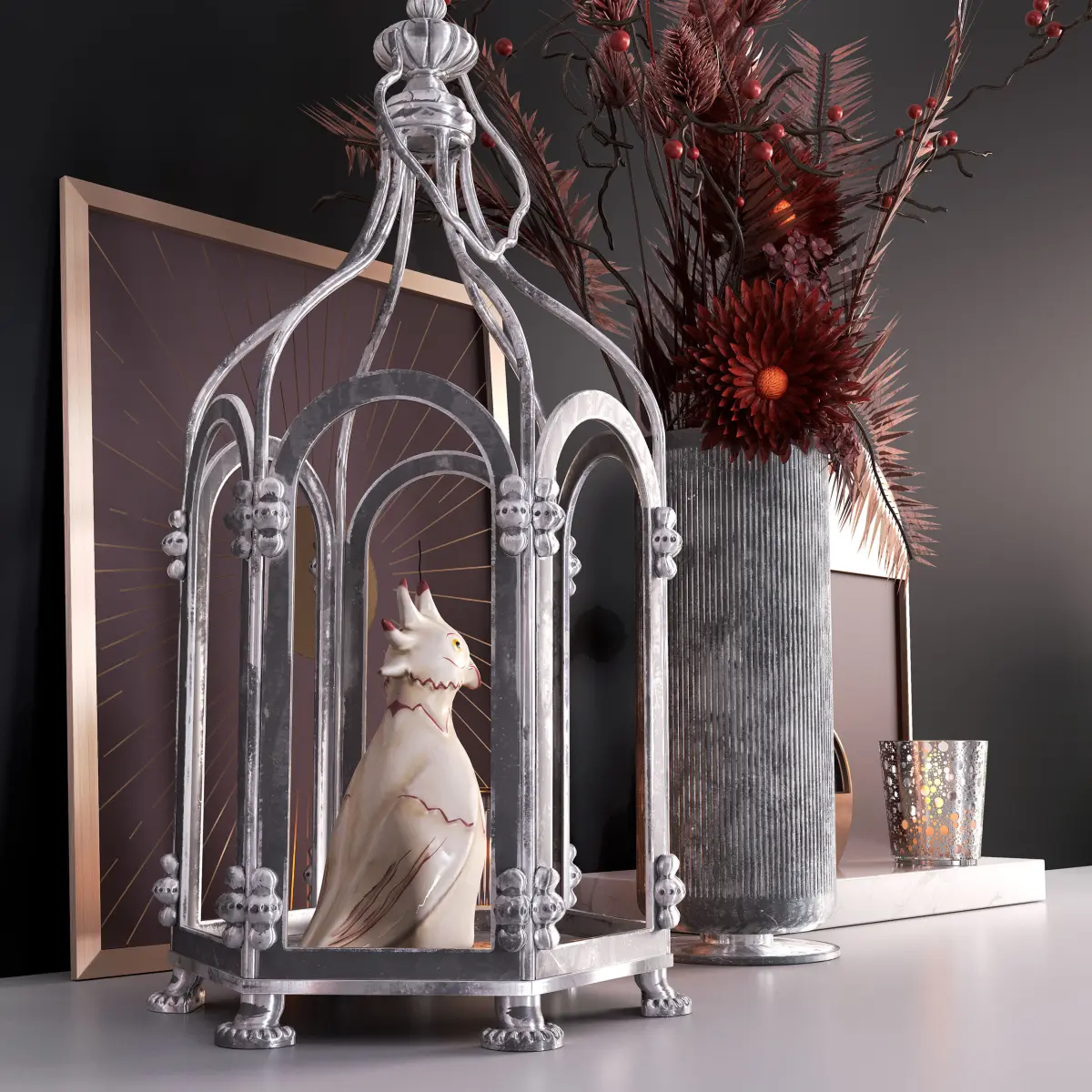 Highly photorealistic model of a stylish decorative set with cage and flowers;All materials are set up and ready for rendering in Corona and Vray.