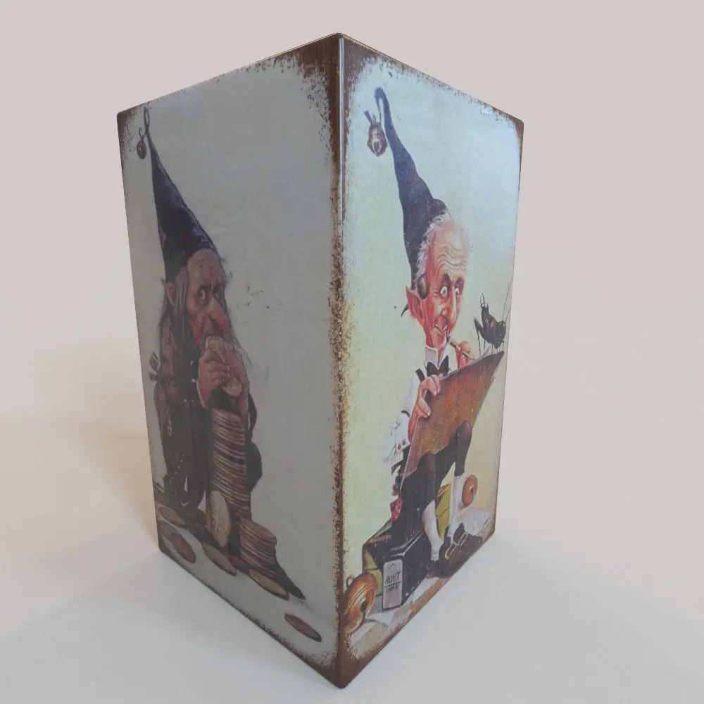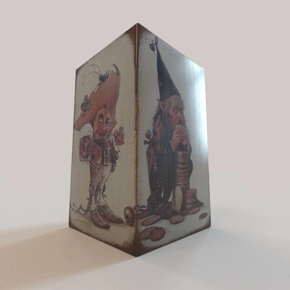 Wooden box with decoupage. There are four little dwarfs. Fully textured. Made with V-Ray and Corona Render.