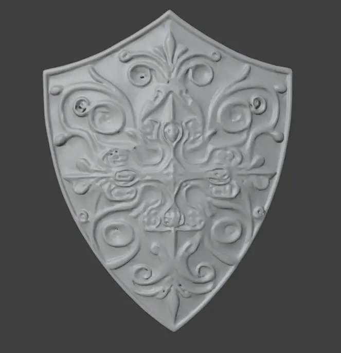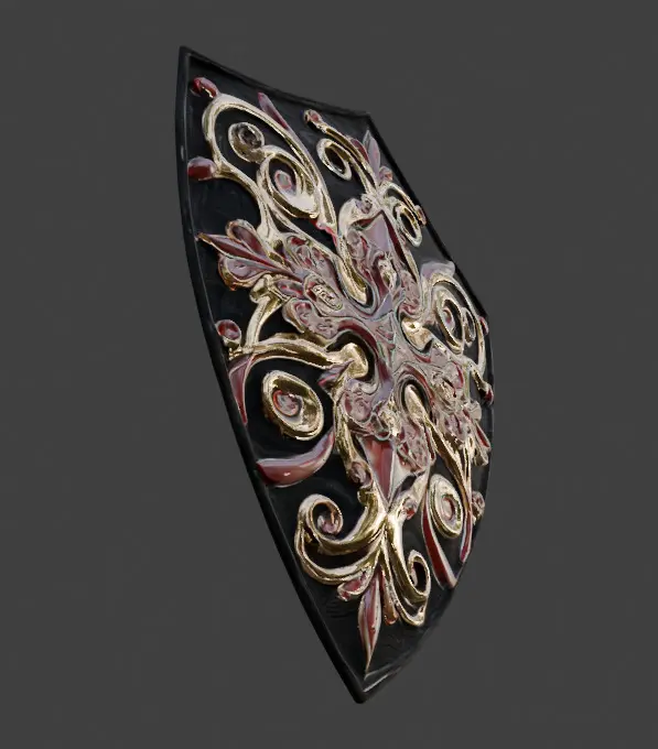This highly detailed 3D model of an ornate medieval shield features an intricate design with golden filigree, crimson red accents, and a black enamel base. Ideal for use in fantasy games, cinematic renders, or historical scenes, this asset brings a touch of regal elegance and gothic artistry. The symmetrical floral and scroll motifs are inspired by Renaissance and Baroque aesthetics, making it perfect for knights, royal guards, or ceremonial armor in 3D environments.