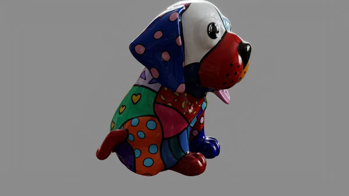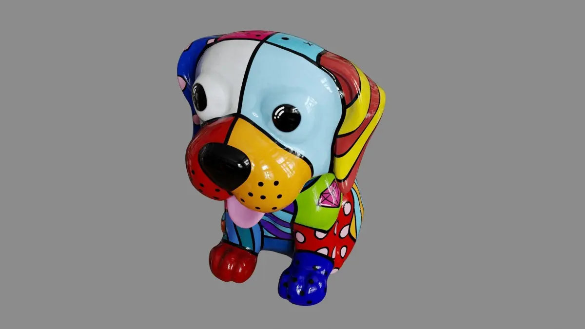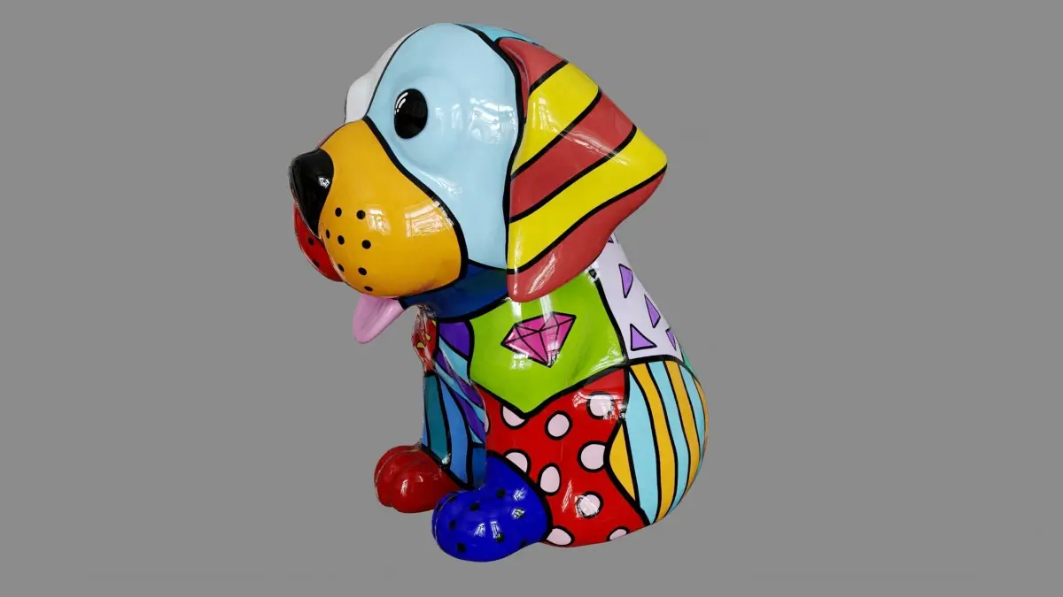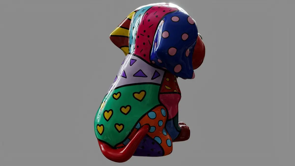 This vibrant and playful 3D model captures the whimsical essence of a pop art dog figurine, reminiscent of the iconic style of Romero Britto. The model boasts clean quad topology for easy modification and comes with a meticulously crafted, high-resolution texture that showcases the figurine's colorful, geometric patterns and bold outlines.