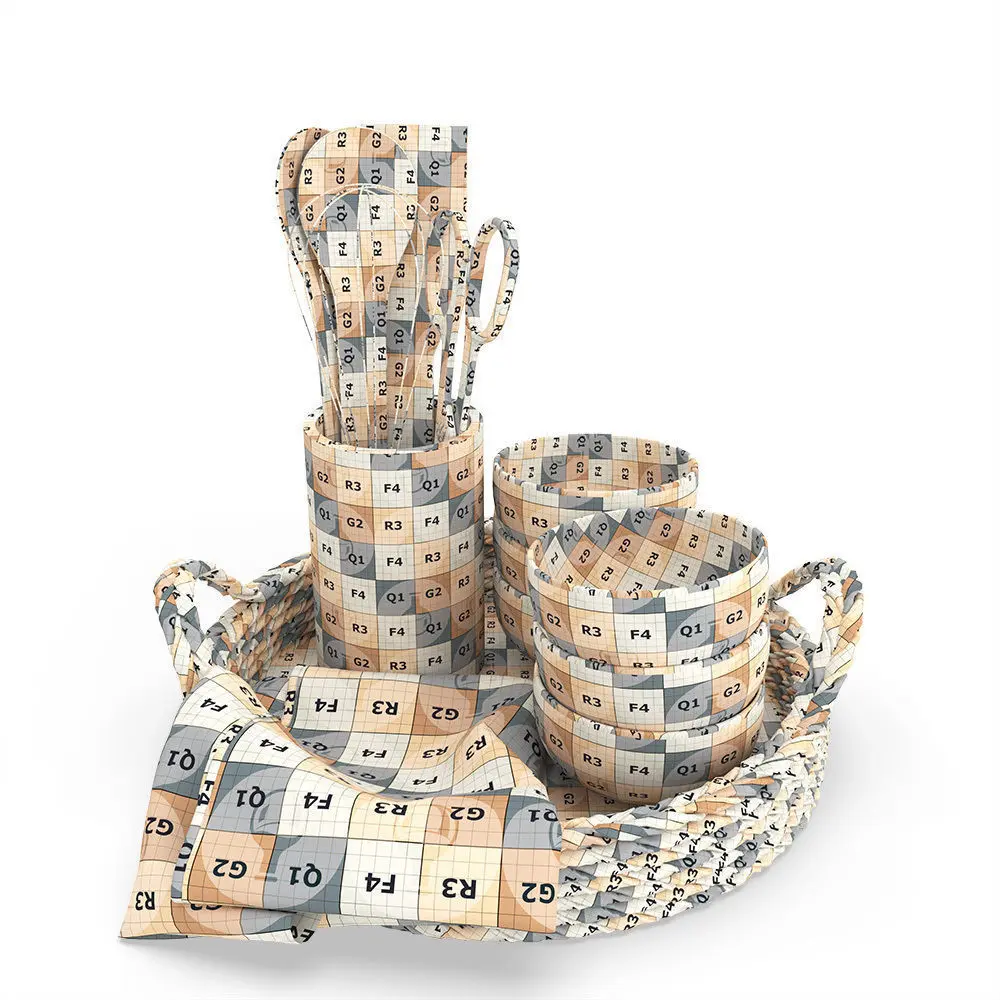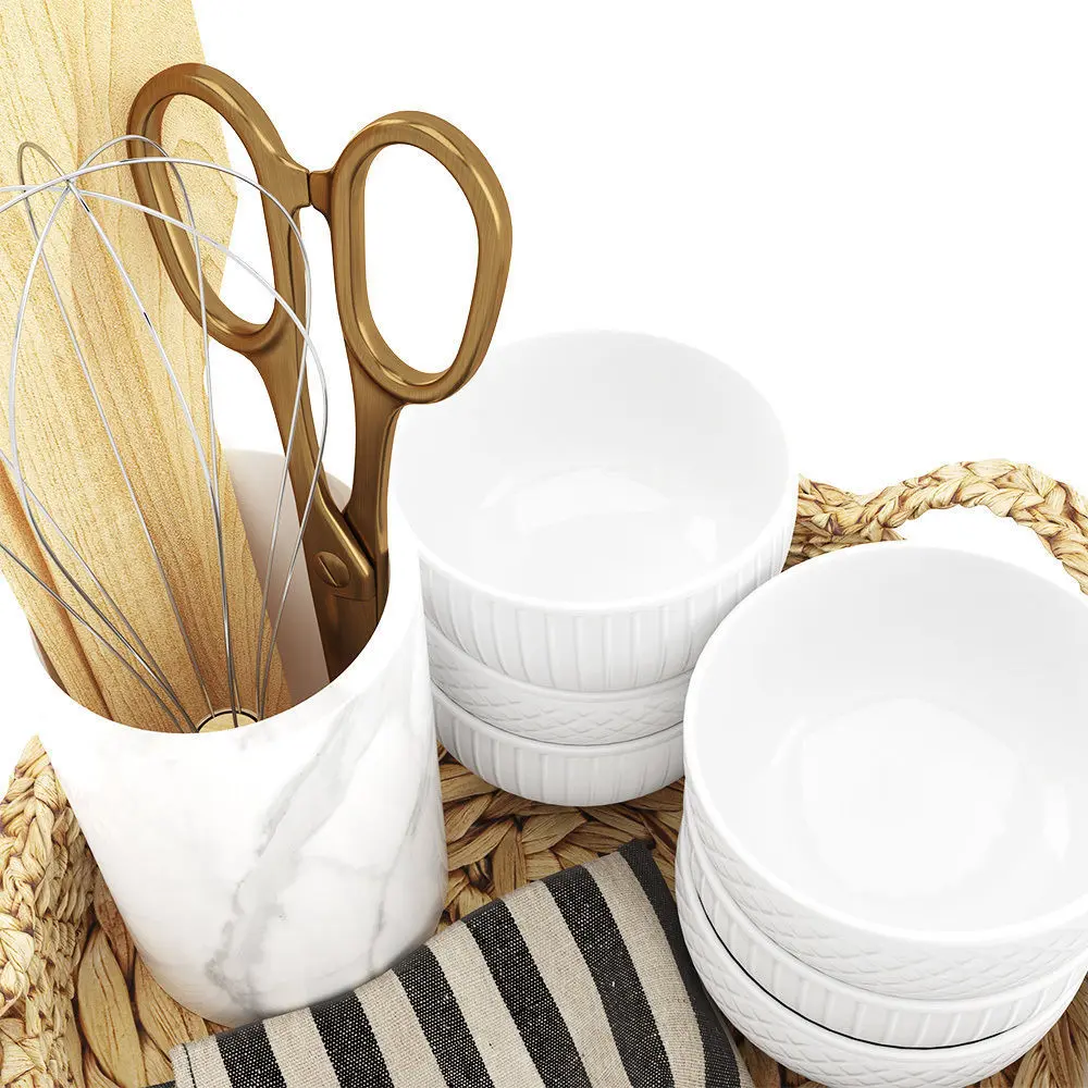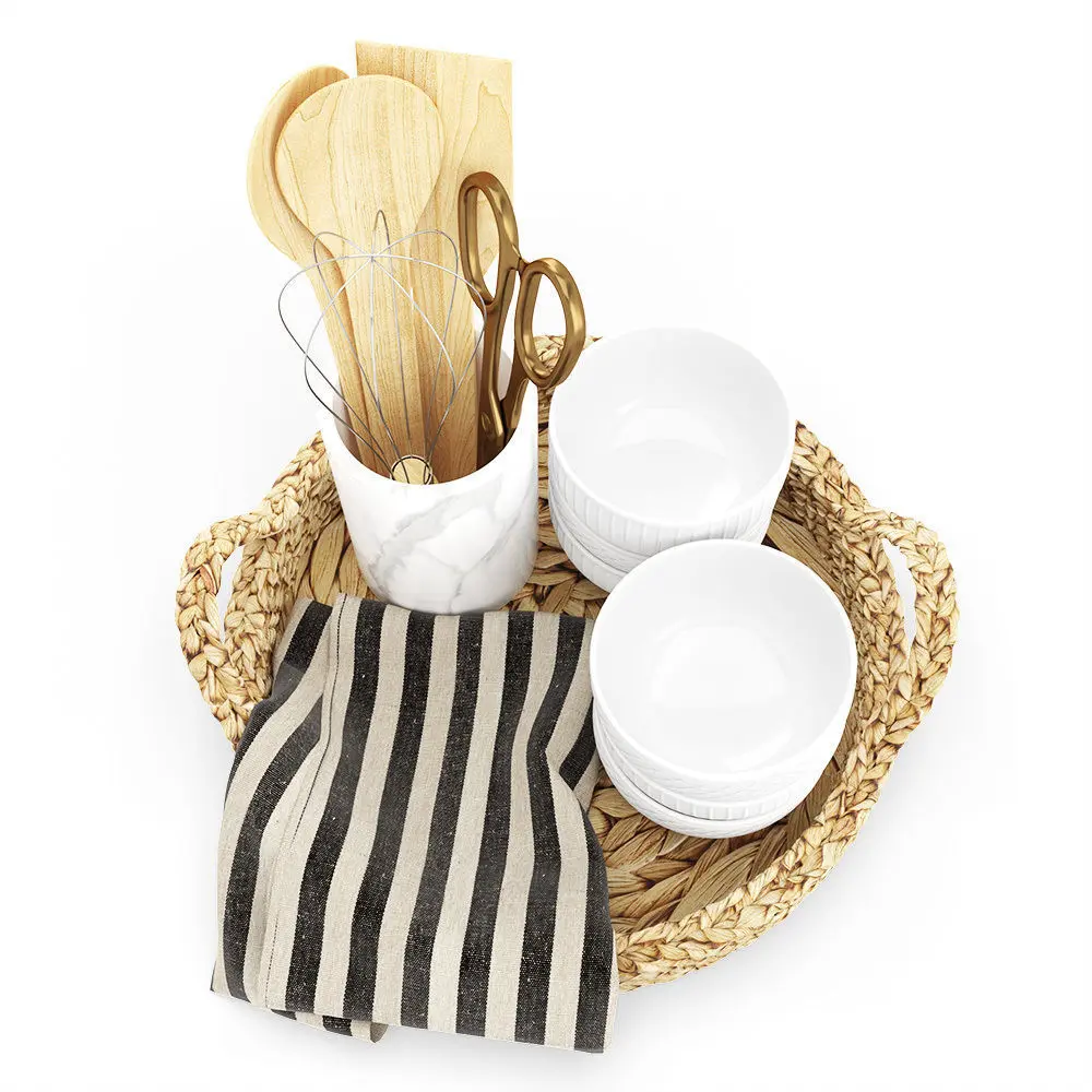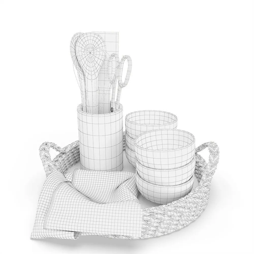 Set of 3D models for kitchen decoration. Contains a rattan basket with a kitchen towel on it, six textured bowls, a marble kitchenware holder with two wooden spoons, a wooden paddle, scissors, and a hand egg mixer.
