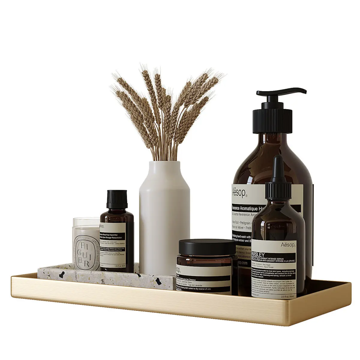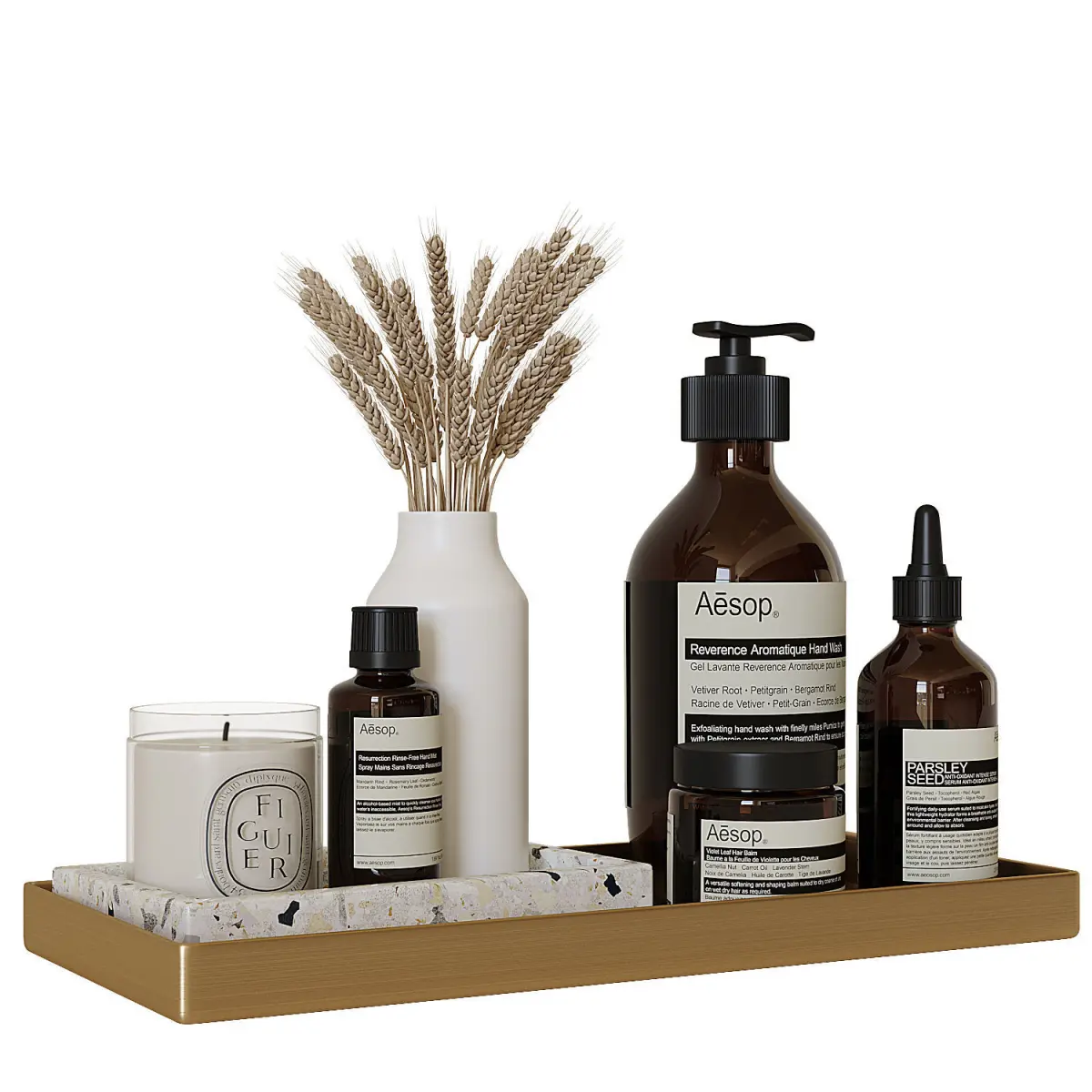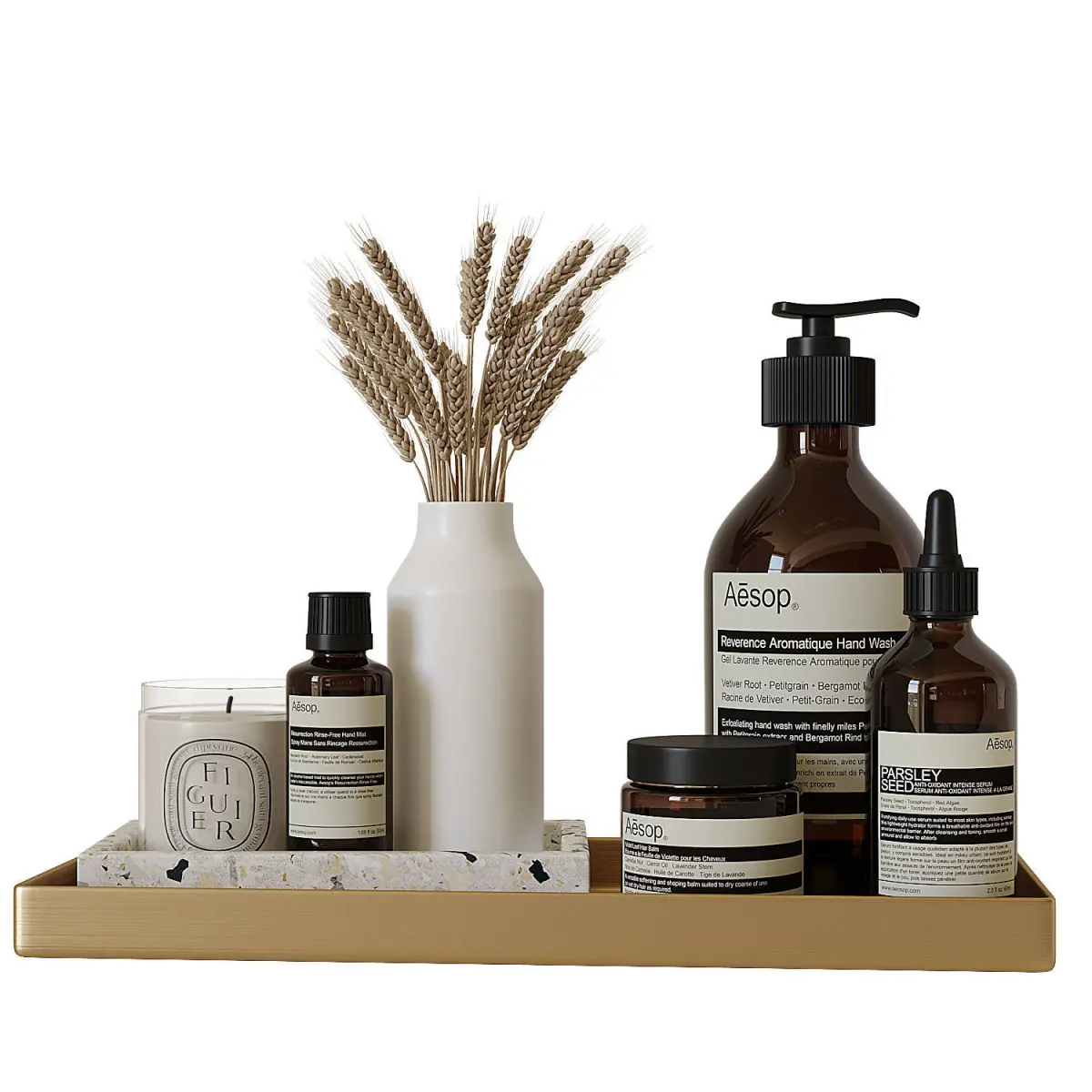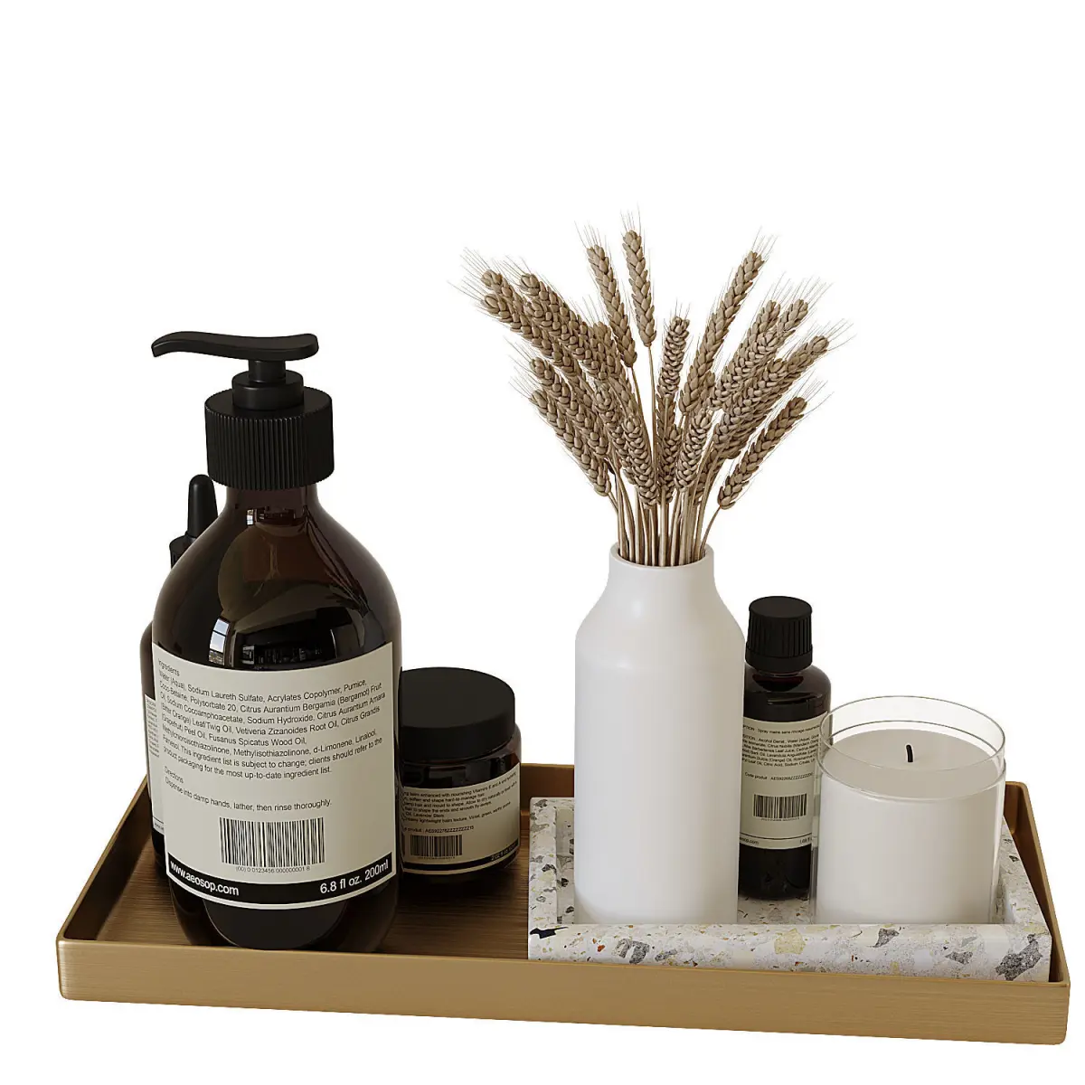 - Decorative set on a metal tray, for a bathroom with Aesop.