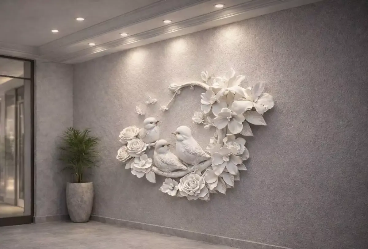 Designed as a statement wall feature, this sculptural piece works beautifully in luxury interiors such as hotel lobbies, residential living rooms, gallery spaces, corridors, and reception areas. The smooth monochromatic finish enhances the intricate detailing of the birds and flowers while allowing lighting and shadows to highlight the sculptural form.