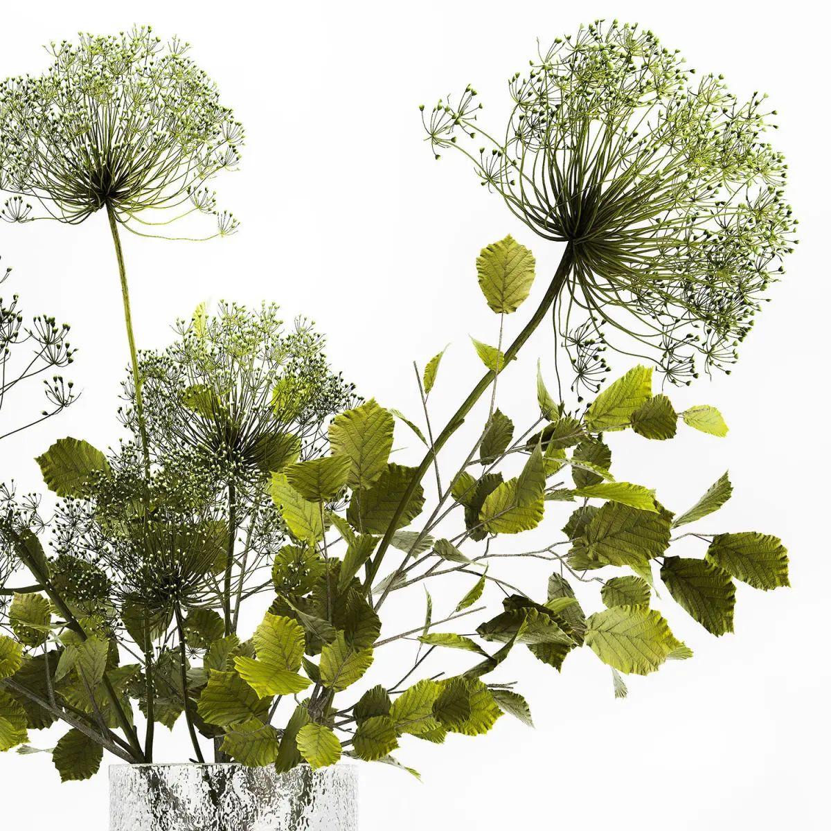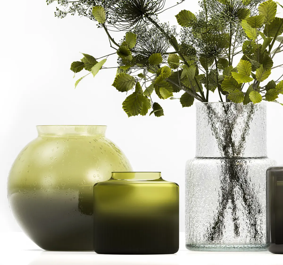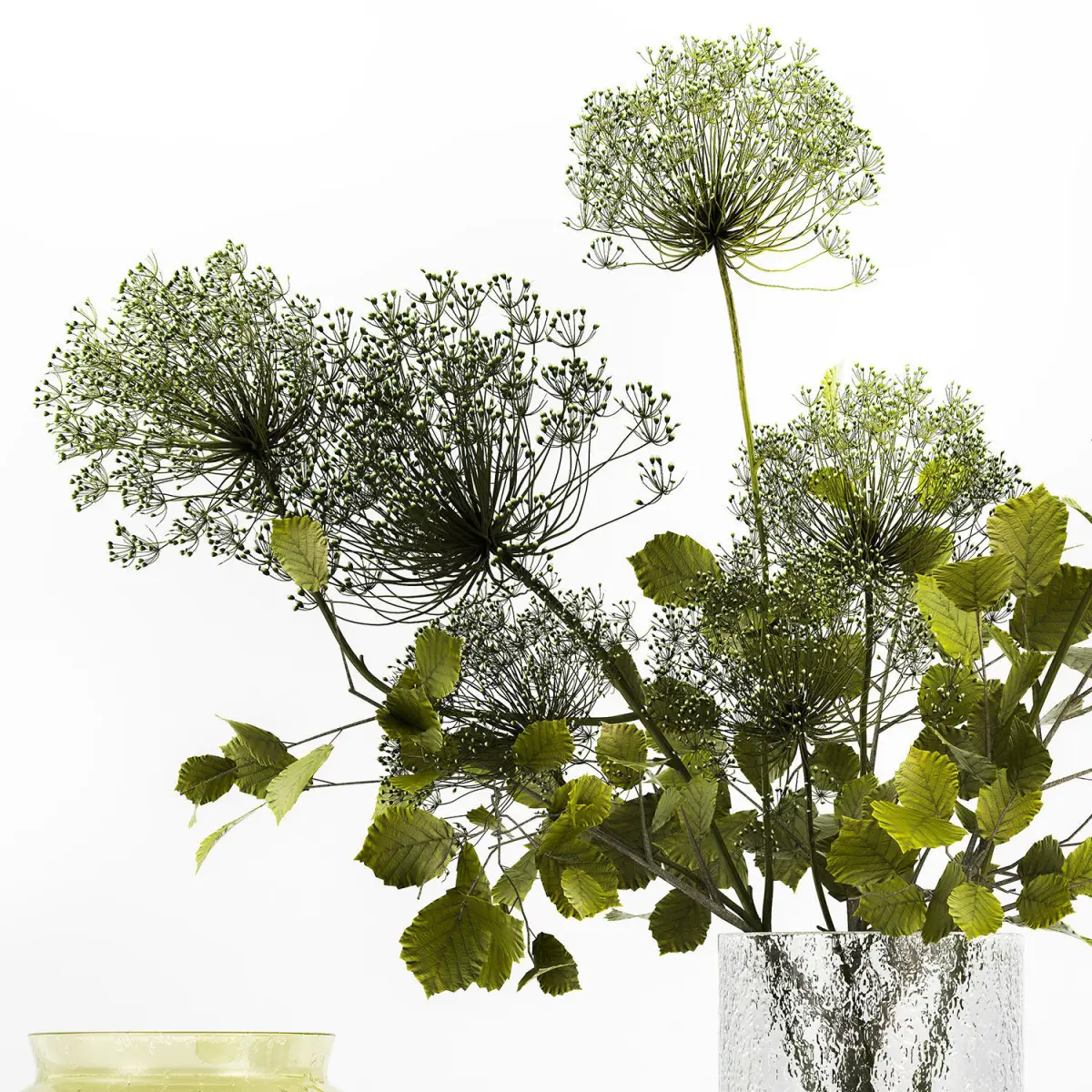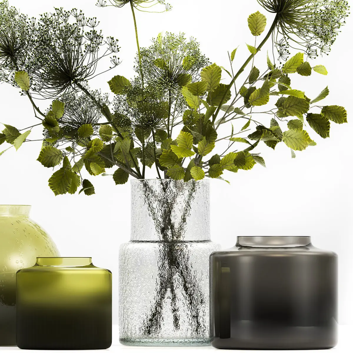Decorative Bouquets from branches in vases for decoration and interior.Bouquet of flowers.Glass vase ikea, IKEA, KONSTFULLHeracleum - hogweedCow Parsnip, hogweedCorylus, filbert, Hazel - hazel, hazelTilia - Lindenbranches, vase, green glass, natural decor, eco design, luxury decor, stylish, ikea, KONSTFULL, Hogweed Bouquet, Hazel, hazel, leaves, Linden branch, set