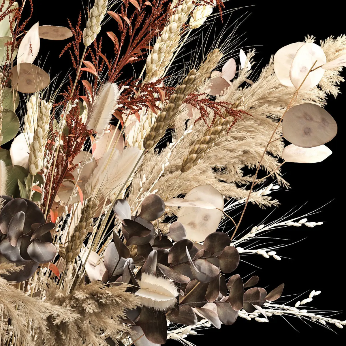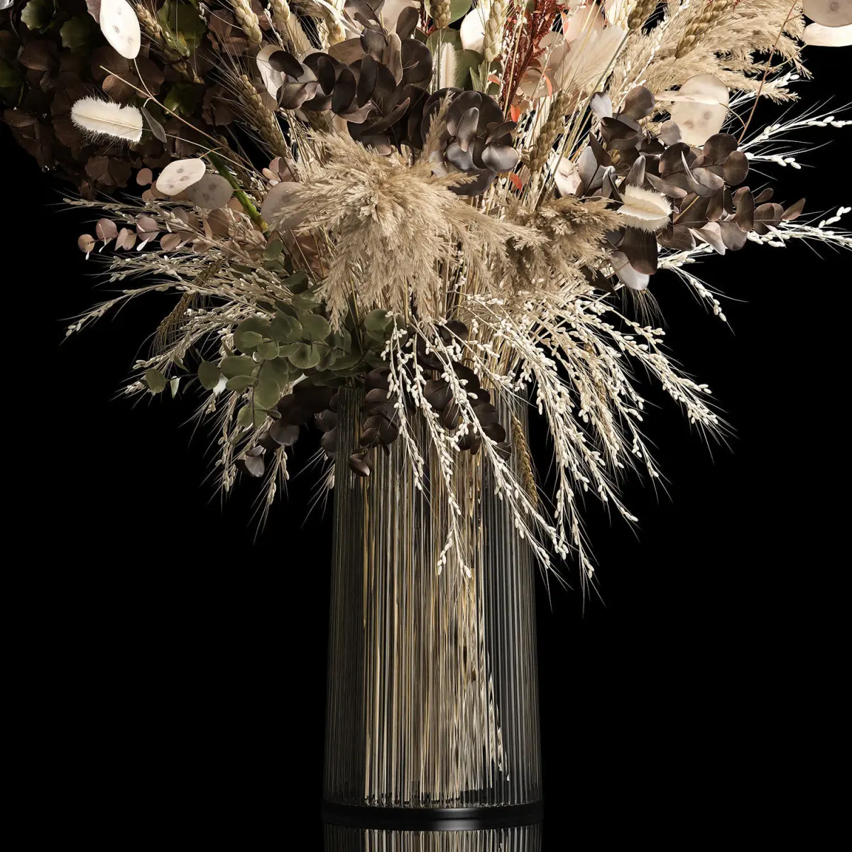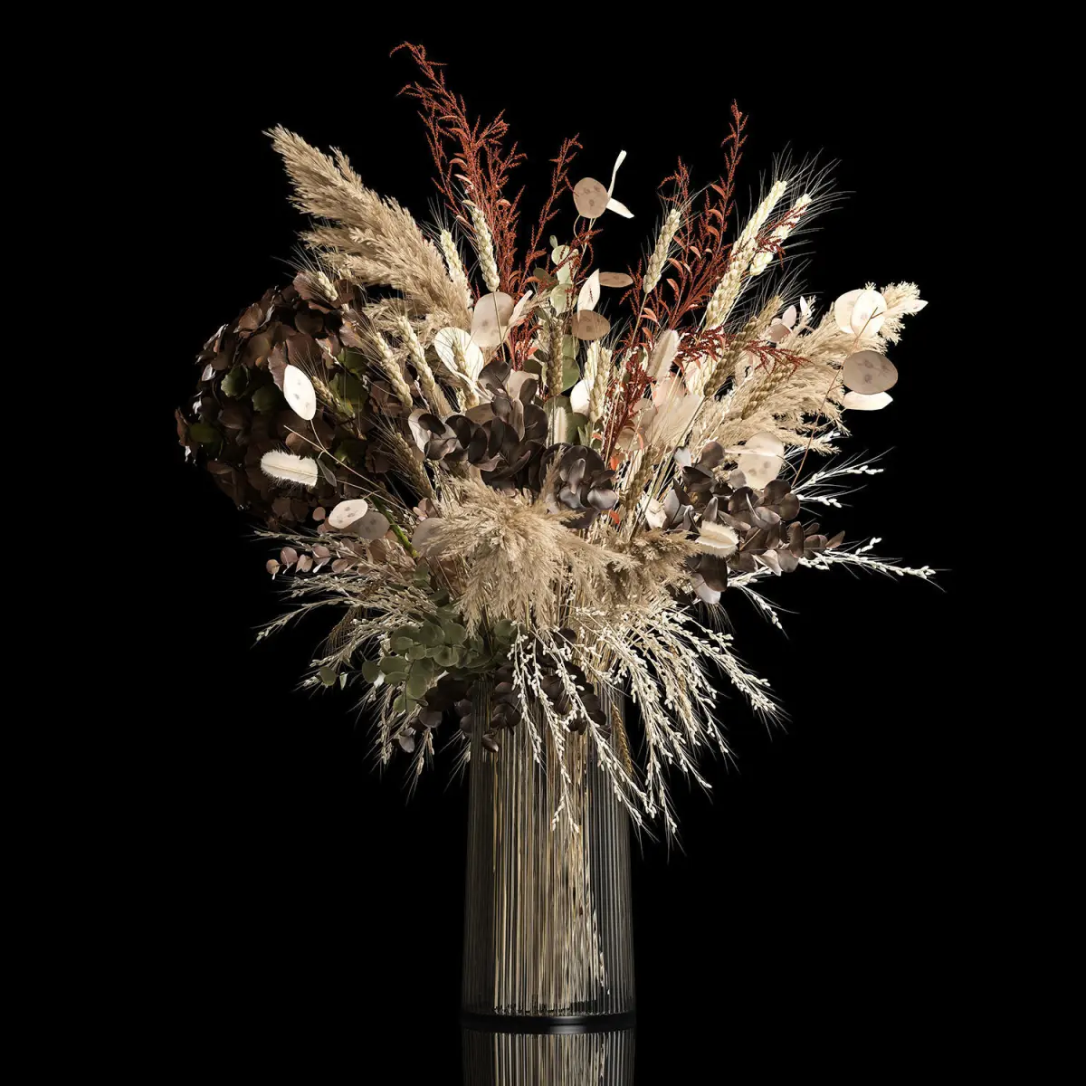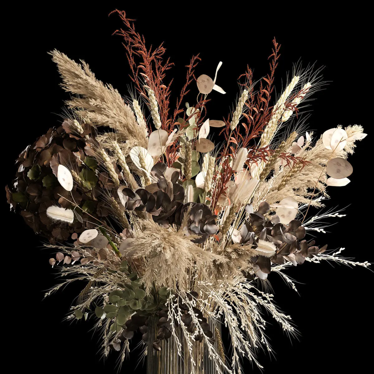 Decorative Bouquets of dried flowers in a glass vase for decoration and interior.Bouquet of dry flowersSOLIDAGO - Goldenrod, Solidago ( dry, stabilized, dyed )Stems, dried pods, natural decorHydrangea - HydrangeaBerberis - BarberryDry reed - Dry reed.Dried flower, dry grass.Triticum, spikelet - wheat, spikeletLunaria - Lunnik, LunariaPampas grass, vase, dried flower, branches, palm leaf, luxury decor, Lunnik, Lunaria, wheat, spikelet, Barberry, branches