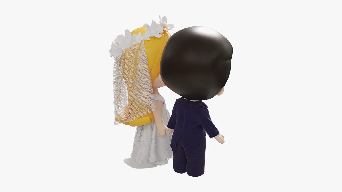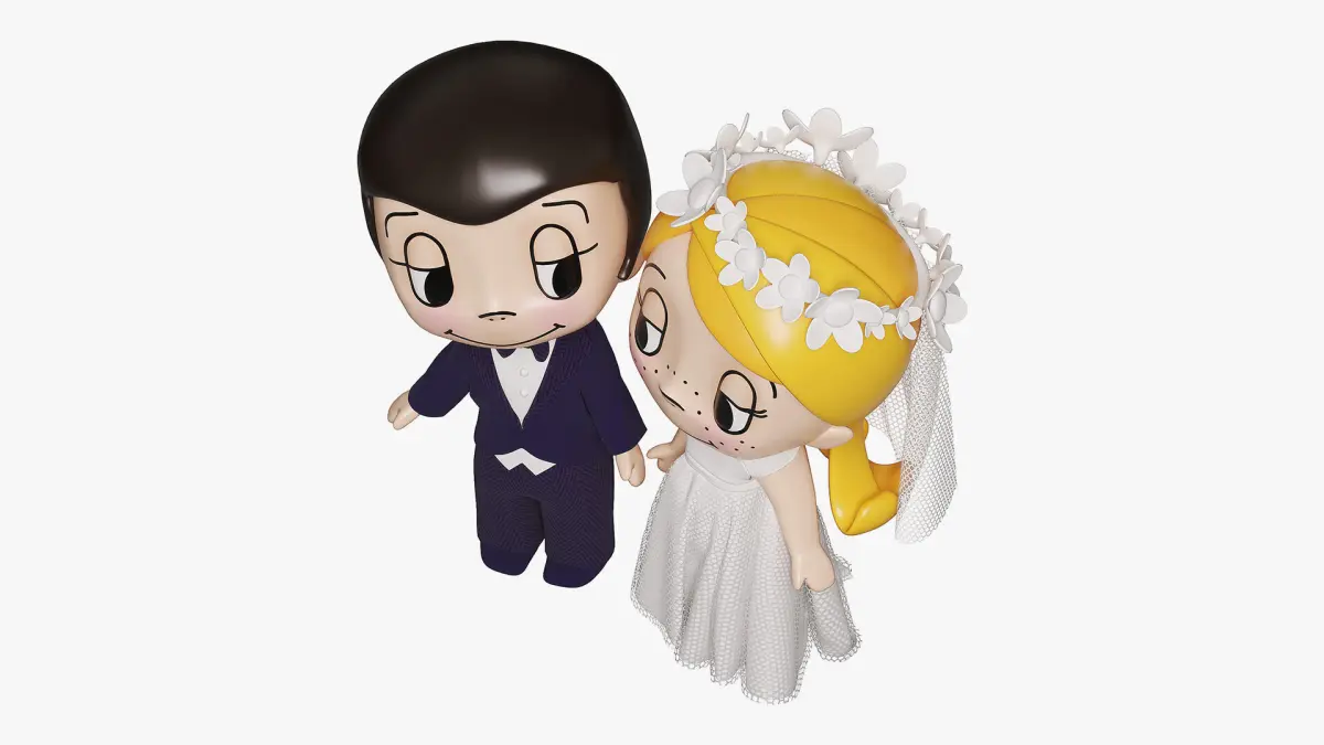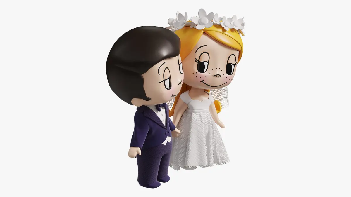Figures inspired by characters from the popular Love Is bubble gum are going to cut out wedding cake toppers, window displays, store layout, bridal supply store.