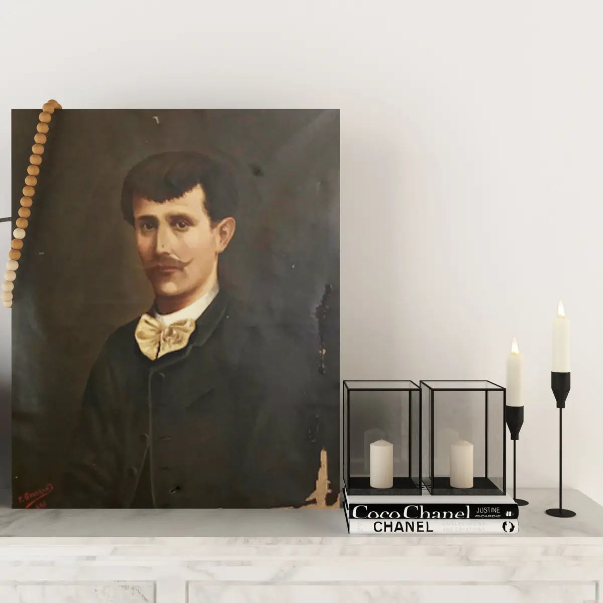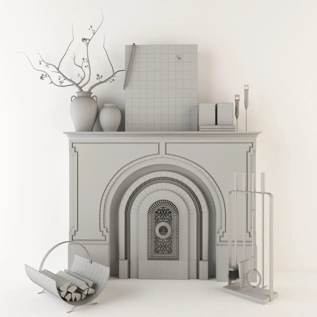 Decorative fireplace dimensions : W122cm D24cm H96cm .Black steel firewood log Rack .Black steel Fireplace tool sets include : a poker , tongs , shovel , brush and tool stand Dimensions: W60 H 71 Metal door fireplace .