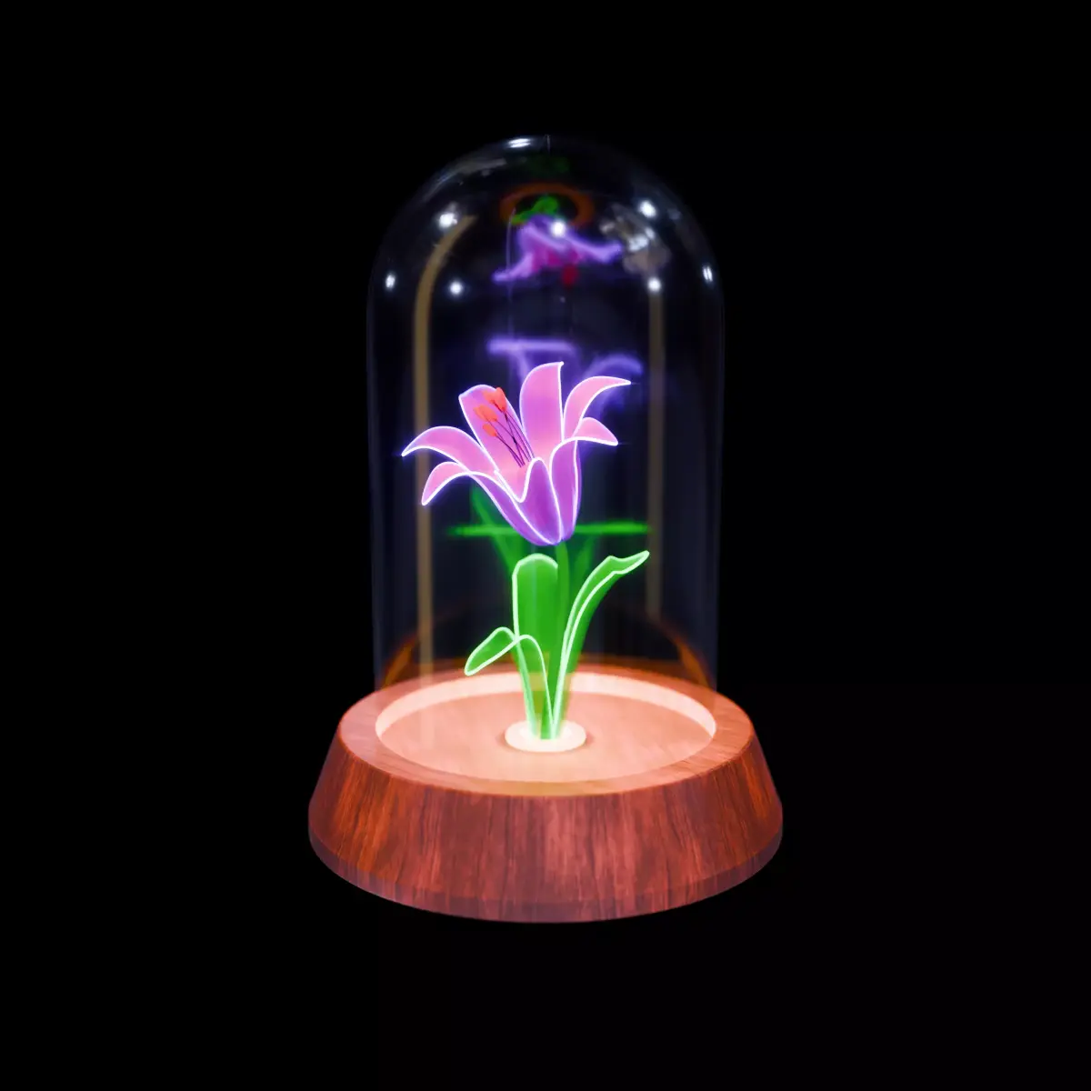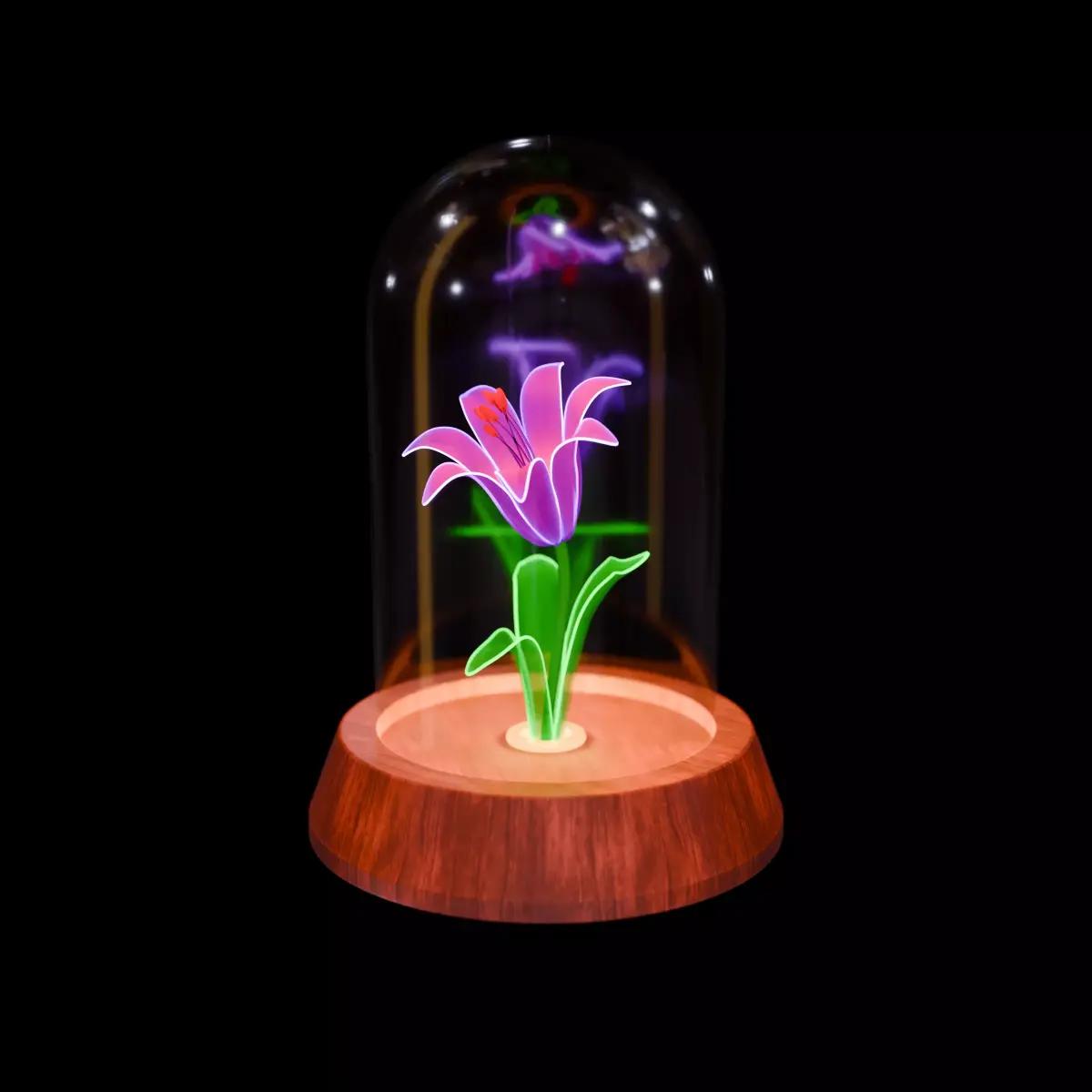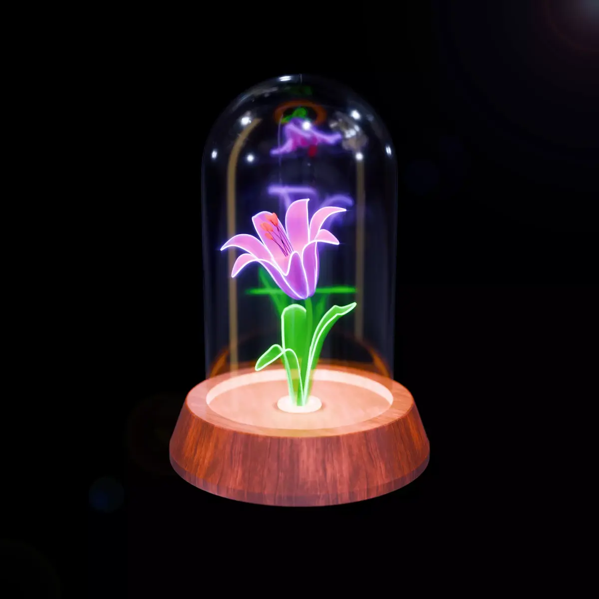 The lamp features a glowing flower enclosed inside a glass dome, placed on a wooden base, creating a calm and aesthetic ambient lighting effect. It is suitable for use in interior visualizations such as bedrooms, living rooms, studios, showcase setups, and cinematic or concept renders where soft mood lighting is required. The model is built with a scene-ready workflow, making it easy to place directly into scenes without additional setup.