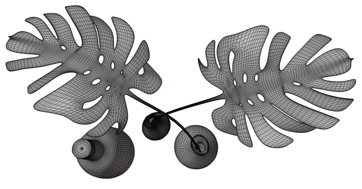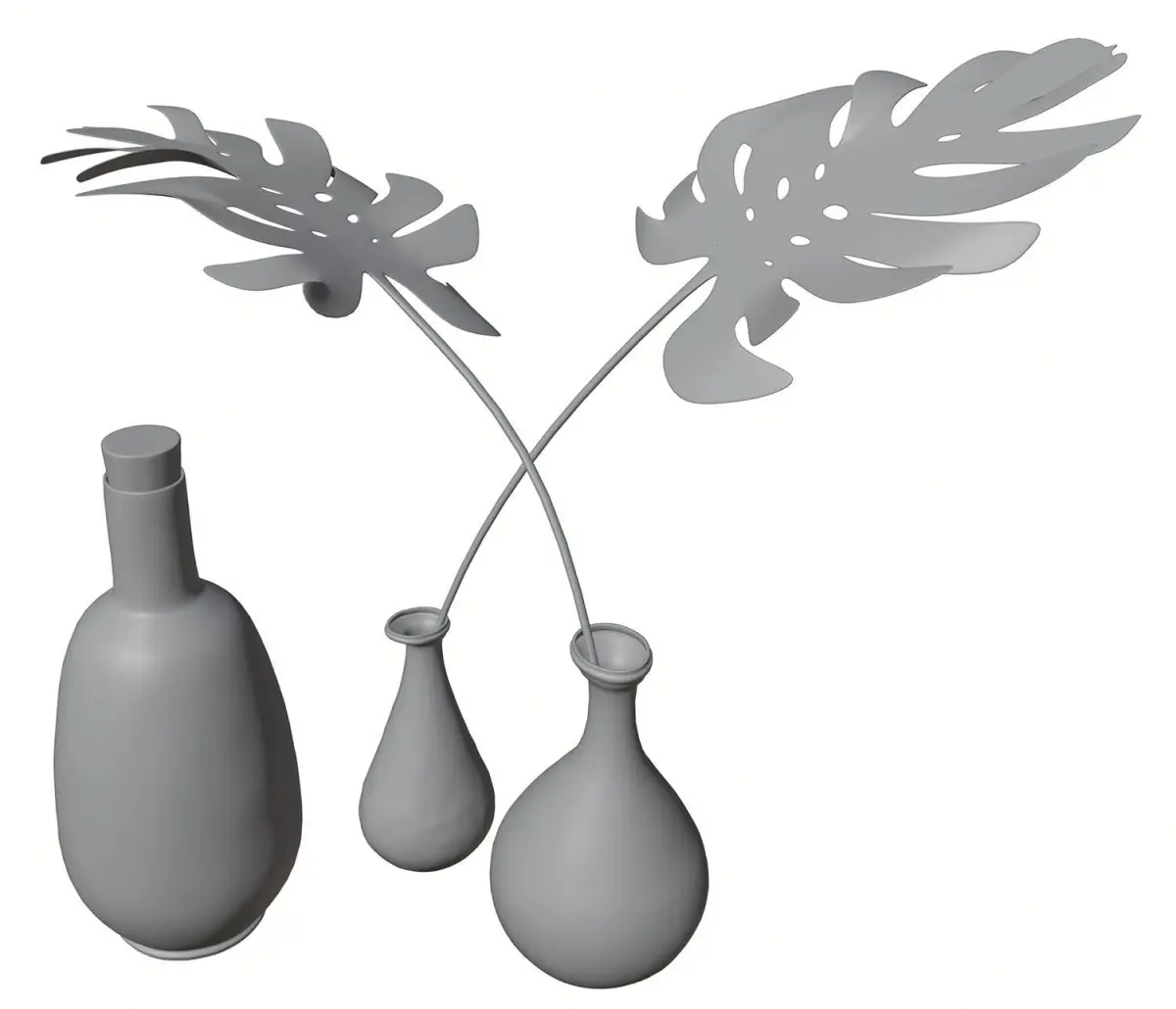 This high quality model includes three transparent glass vases. In the middle placed large, broad leaves. Model prepared for 3d architectural visualisations and other graphic works.