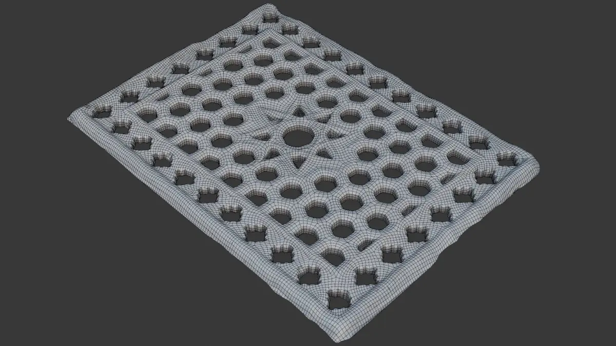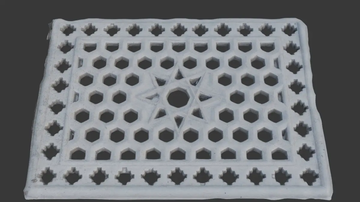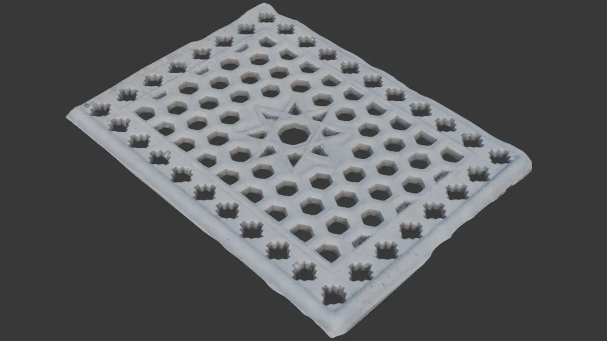 Highly detailed 3D scan of a rectangular decorative grate with a geometric star and hexagonal pattern, featuring a weathered white finish. Ideal for architectural accents, floor grates, vent covers, or as a decorative element in various indoor or outdoor scenes. The model is provided in multiple formats (BLEND, FBX, OBJ, GLB, USD, STL) and includes 4K PBR textures for seamless integration in any pipeline.