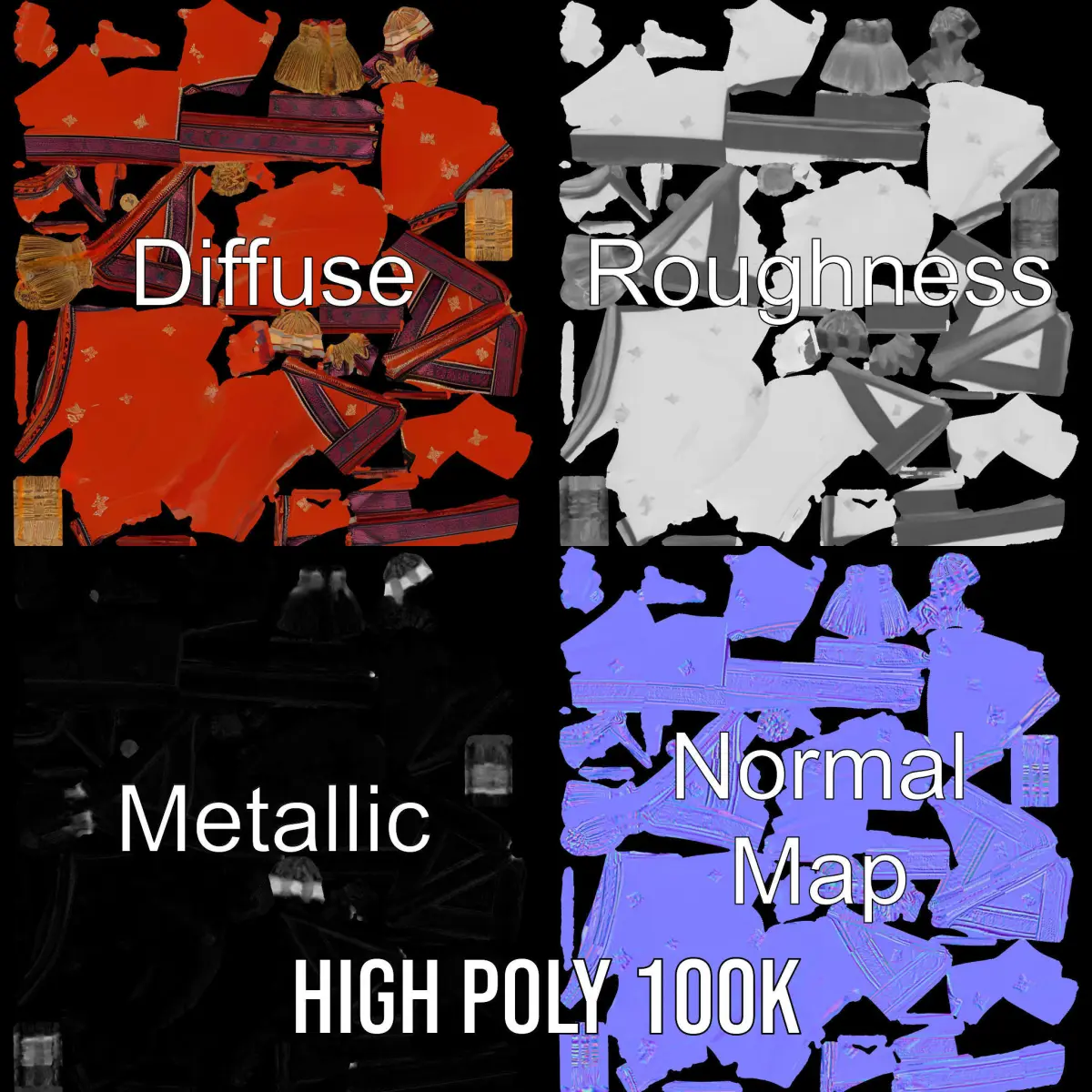 This model pack features a decorative hanging banner adorned with intricate patterns and tassels, perfect for adding elegance to any virtual environment. With three levels of detail (LOD), it can be easily integrated into both real-time gaming engines and high-quality rendering software. The model is crafted with precision, featuring PBR textures, Diffuse, NormalMap, and reflection/roughness/metallic maps, all at a resolution of 4096x4096. Fully unwrapped and non-overlapping UVs ensure superior quality and realism. Ideal for historical scenes, thematic decorations, or enhancing interior designs in both virtual and interactive presentations.