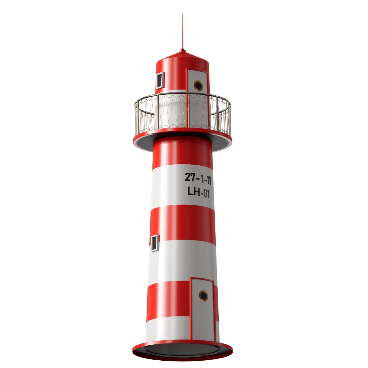 3D model of a decorative lighthouse. Made of metal. Color - white with red. The lighthouse is equipped with an observation deck with a metal fence, doors, observation windows. The model can be used for its intended purpose as a lighthouse, or as a decorative element in the exterior.