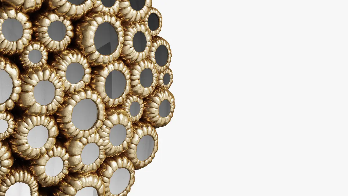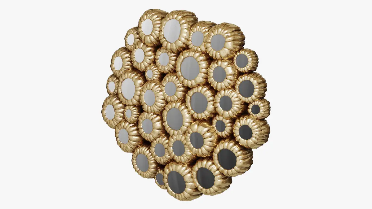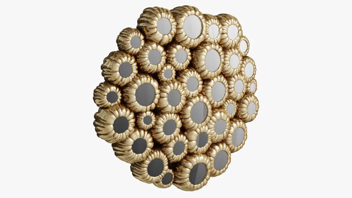 Decorative mirror panel in yellow metal. Frames imitate flower buds.