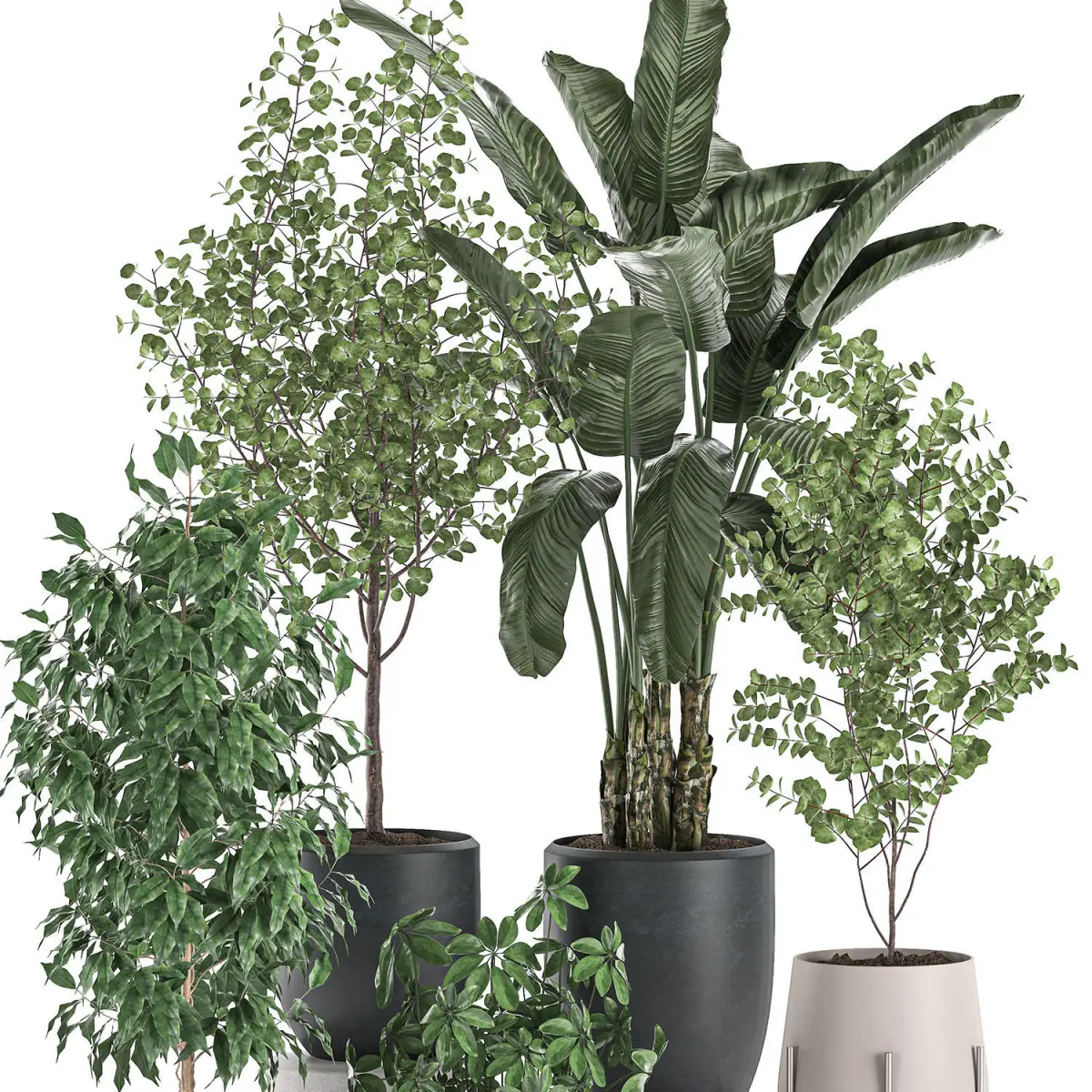 Decorative plants for interior decoration in pots.Houseplantsexotic plantsTropical plantsEucalyptus cinereaArgyle AppleDecorative trees for interiorFicus benjaminabanana palmRavenala madagascariensisStrelitziaSchefflera arboricola