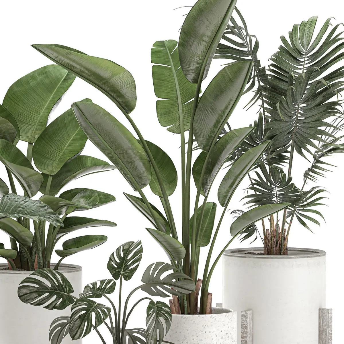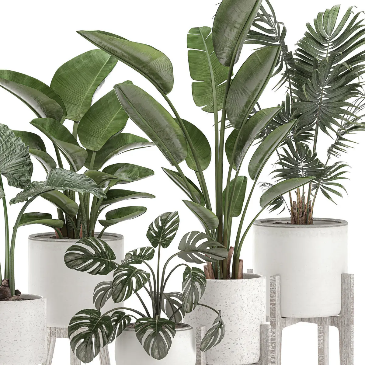 Decorative plants for the interior in white pots.Houseplantsexotic plantsTropical plantsHowea forsterianaDate palmMonsteraAlocasiabanana palmRavenala madagascariensisStrelitzia
