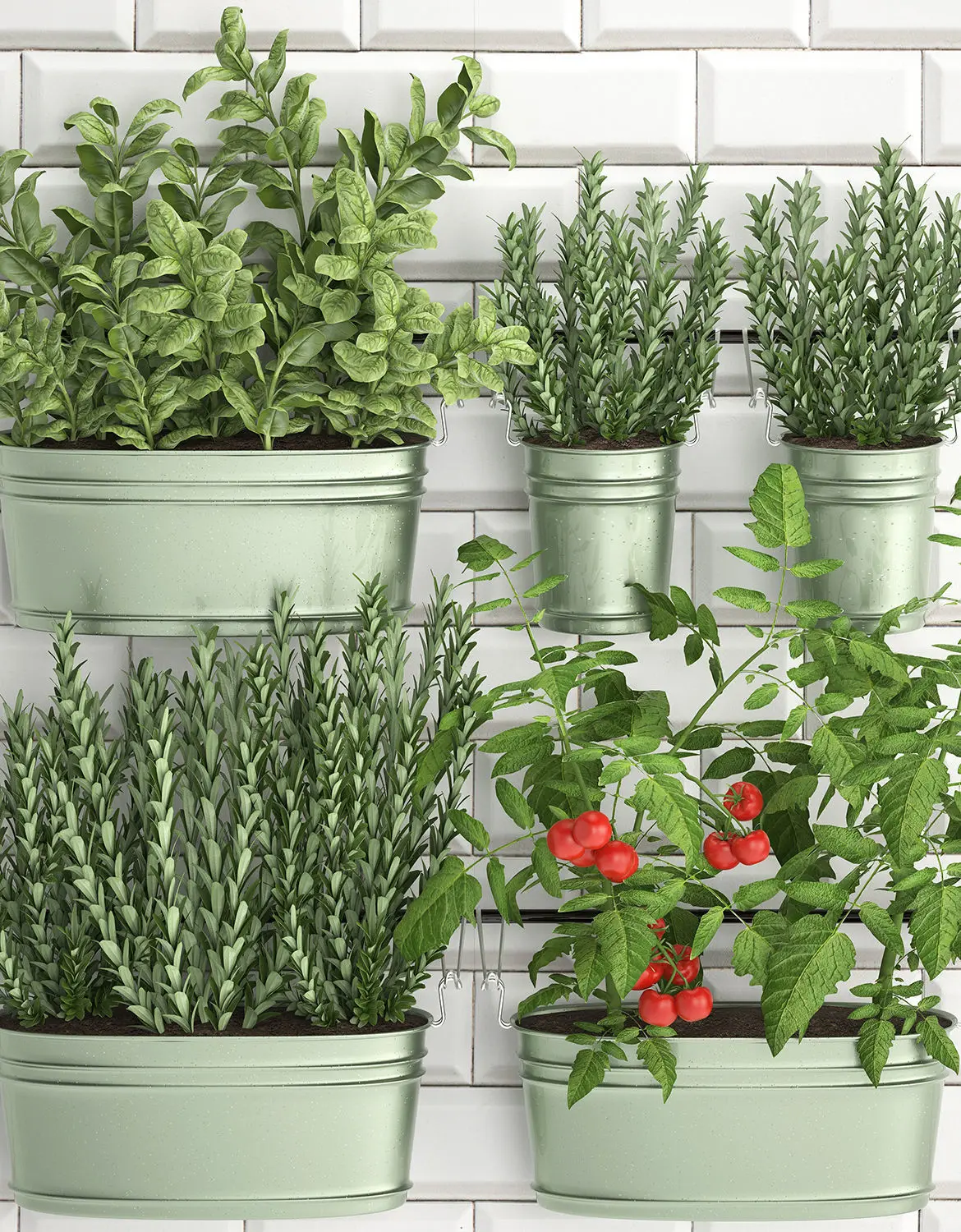 decorative plants for the kitchen on railingrailing kitchenrailing with plantsHouseplantsexotic plantsCollection of ornamental plantsRosemary - RosmarinusTomatoBasil ocimum basilicumgreentilekitchen apron