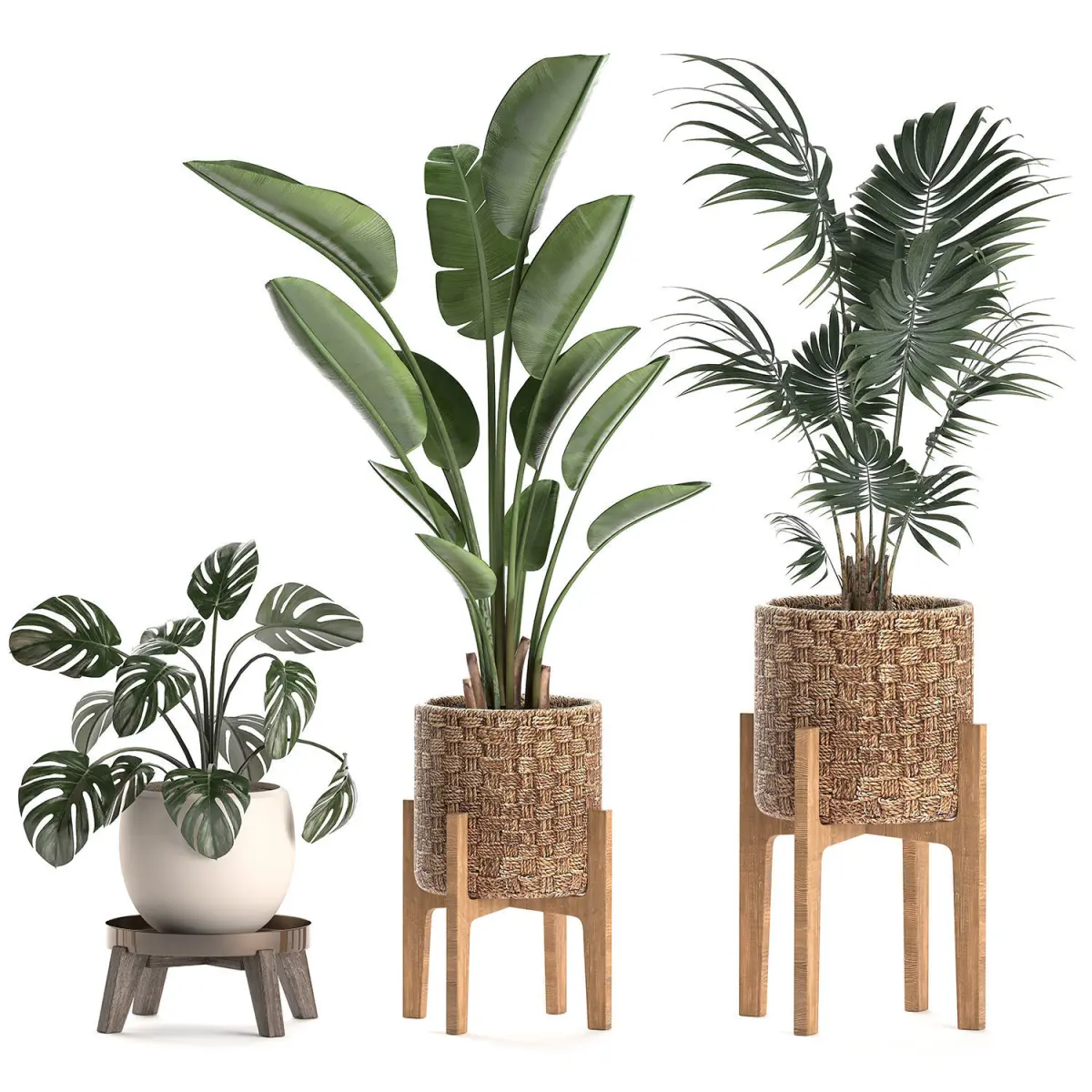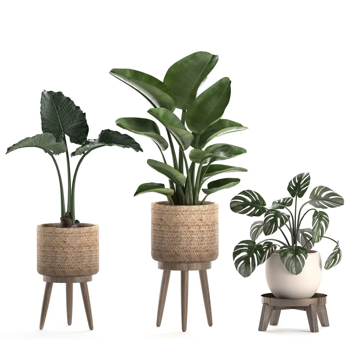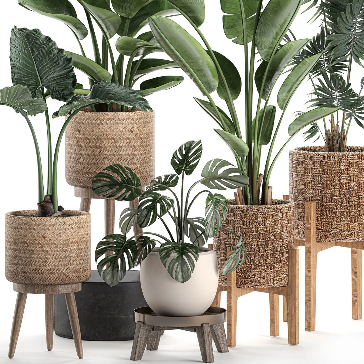 Decorative plants for the interior in baskets.Houseplantsexotic plantsTropical plantsHowea forsterianaDate palmMonsteraAlocasiaBanana palm in a basketbanana palmRavenala madagascariensis