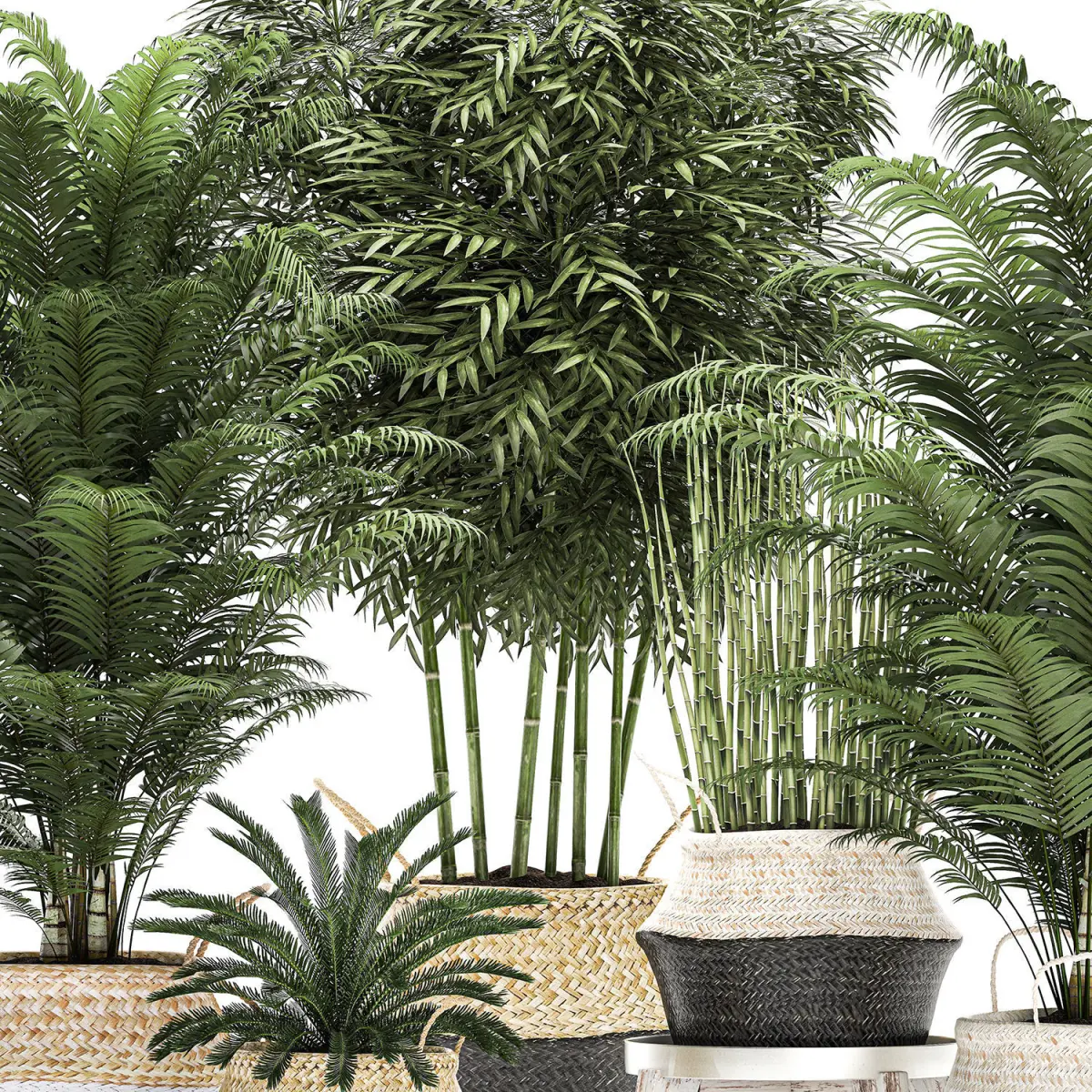 Decorative plants in basket.Houseplants exotic plants.Tropical plants.Rattan basket interior.Rattan basketBamboo in a basketDecorative bambooDypsisCycas - CygnusEquisetum - HorsetailHowea