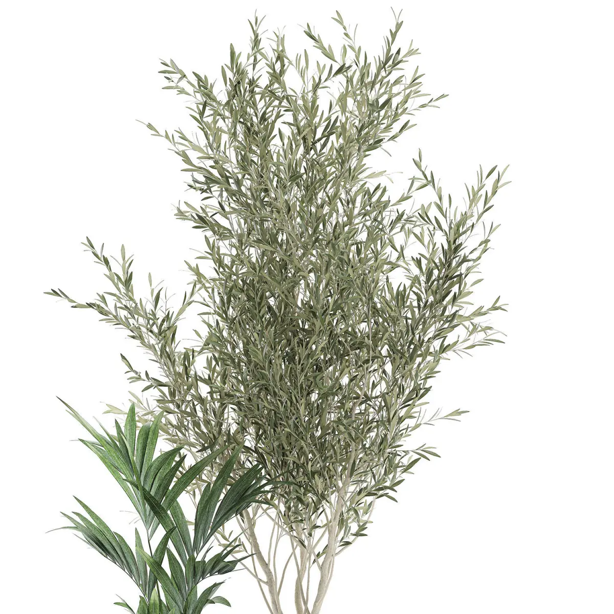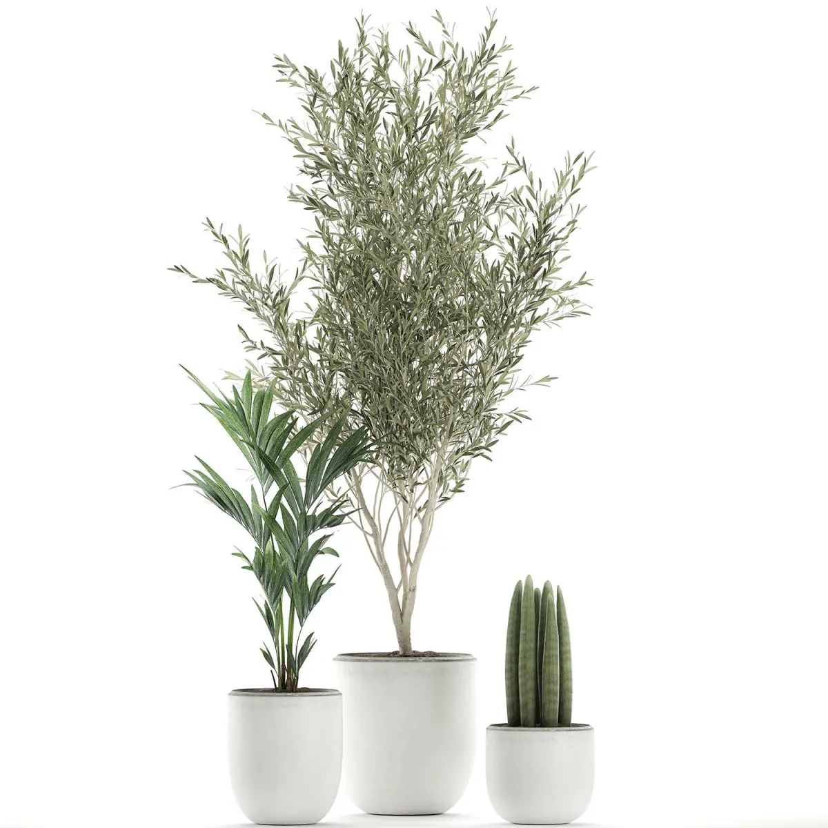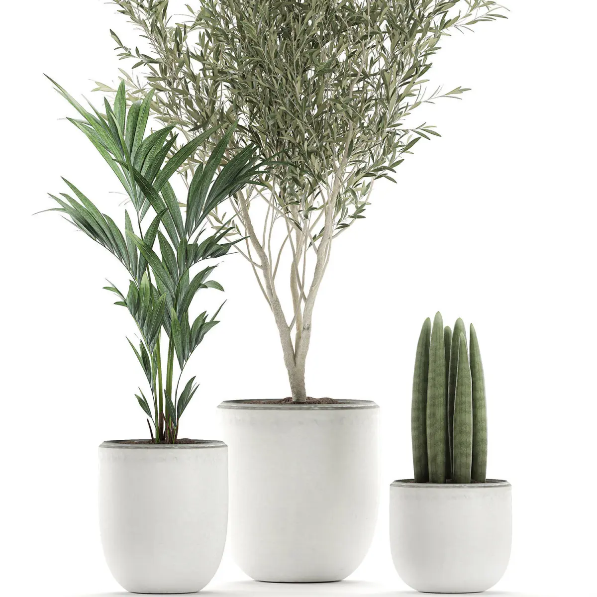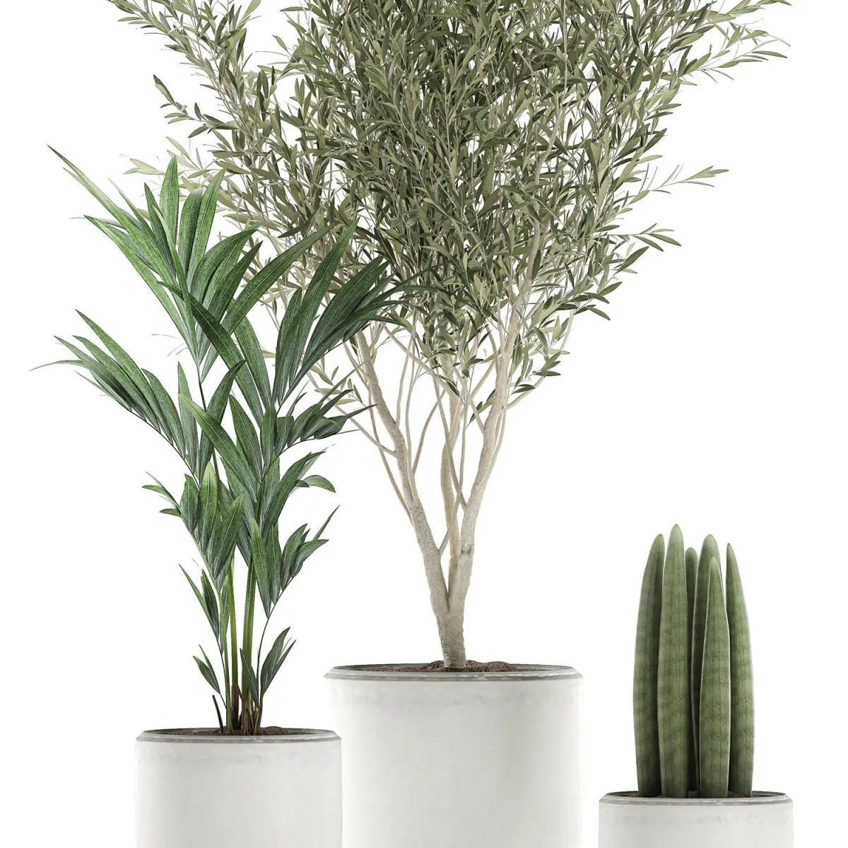 Ornamental plants for the street and interior in white flowerpots.Houseplantsexotic plantsOlea, Olive tree - European oliveDecorative flower potHowea forsterianadate palmSansevieria cylindrica