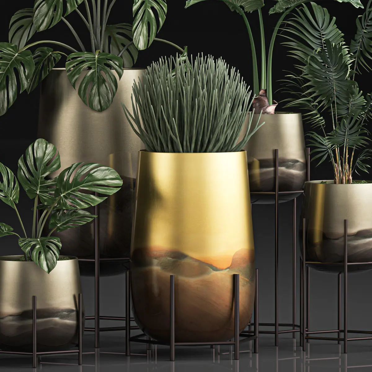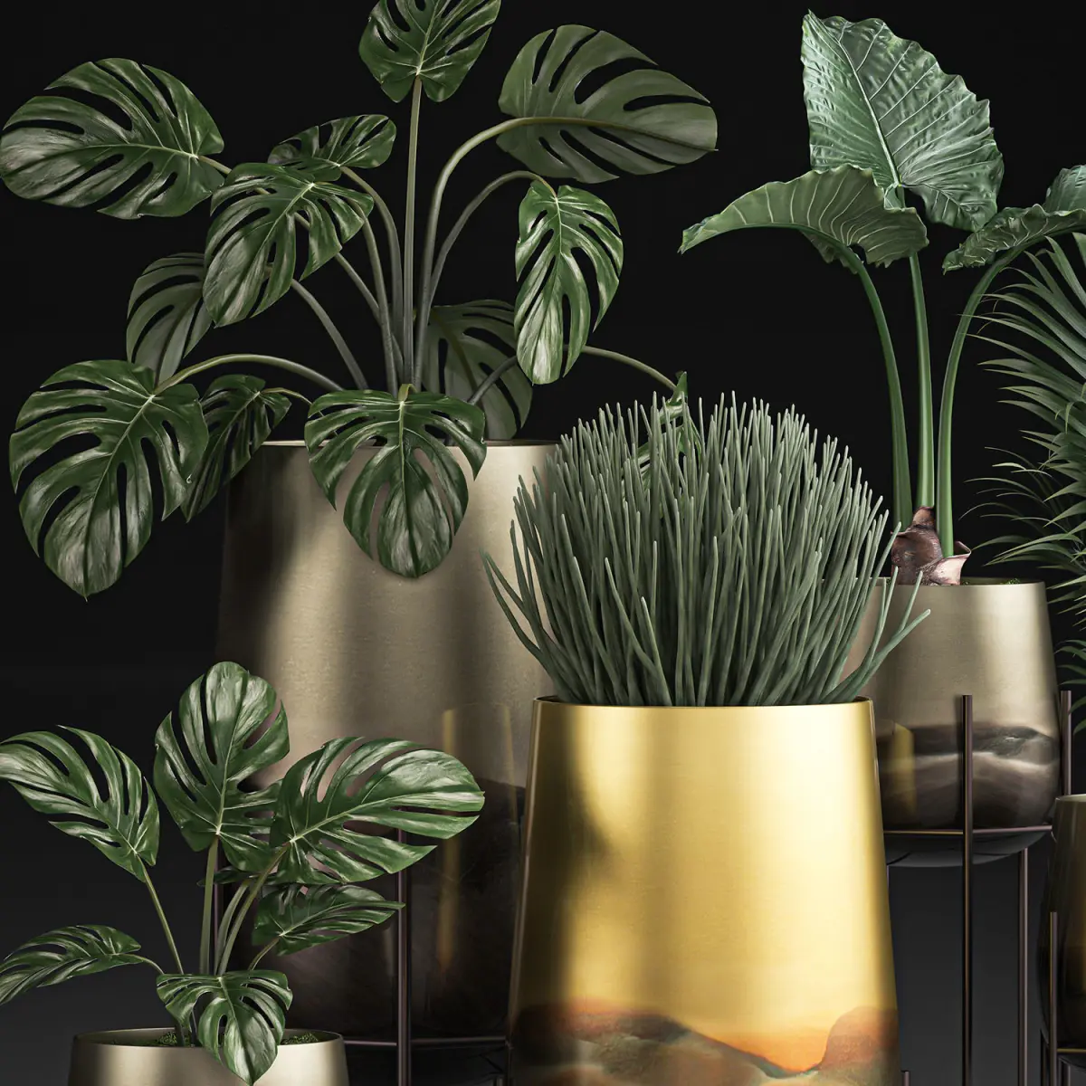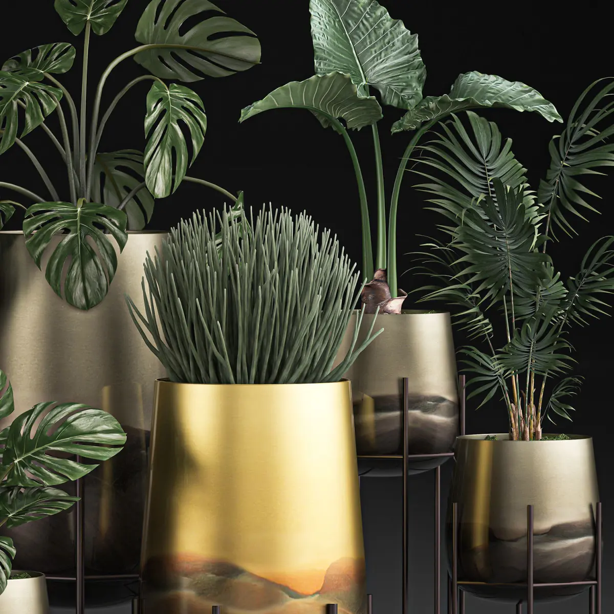 Pot from HAVENLY, CB2.Howea forsterianaKentiaDate palmSansevieria cylindricaMonsteraAlocasiaLuxury Gold Pots