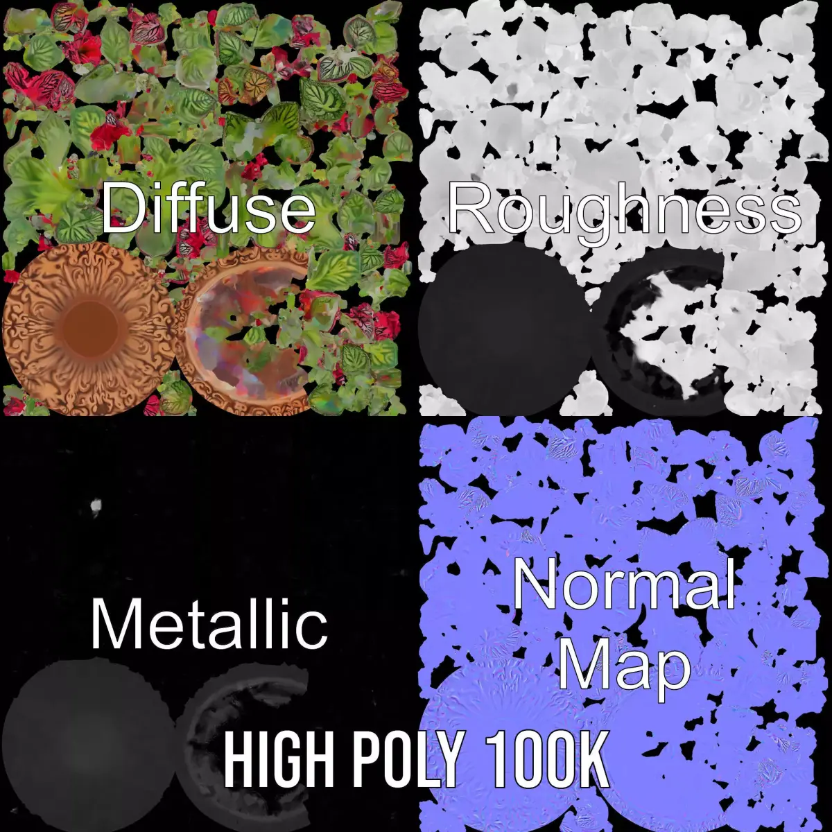 This Decorative Potted Plant model pack offers a realistic 3D representation of a vibrant plant with a detailed ceramic pot. The model is ideal for enhancing interior design scenes, architectural visualizations, and virtual staging projects. Each model has 3 levels of detail: low-poly (1000 triangles for mobile), middle-poly (10,000 triangles for environment), and high-poly (100,000 triangles), which allows for the use of this model in production rendering (such as 3ds max, Maya, Cinema4d, Blender, Vray/Corona/Cycles and all others), game engines (Unity and Unreal compatible), and interactive presentations, providing a choice of detail based on the LOD System principle. The model's textures are PBR, Diffuse, NormalMap, and reflection/roughness/metallic, which are suitable for any modern rendering engine. All models accurately unwrapped and have no overlapping UV. All textures are 4096*4096 in size. If you like this model, please leave a like and a comment. Your feedback is appreciated!