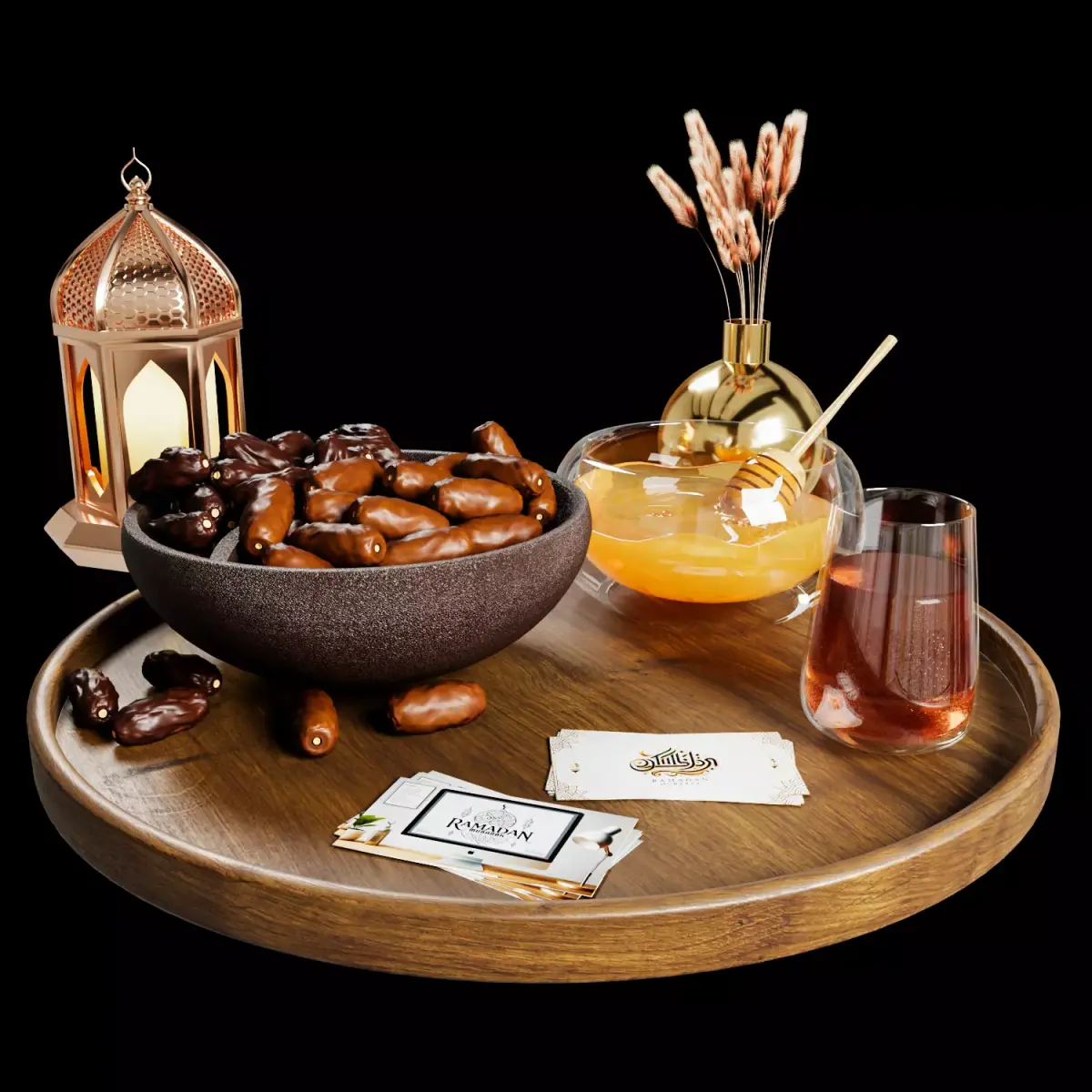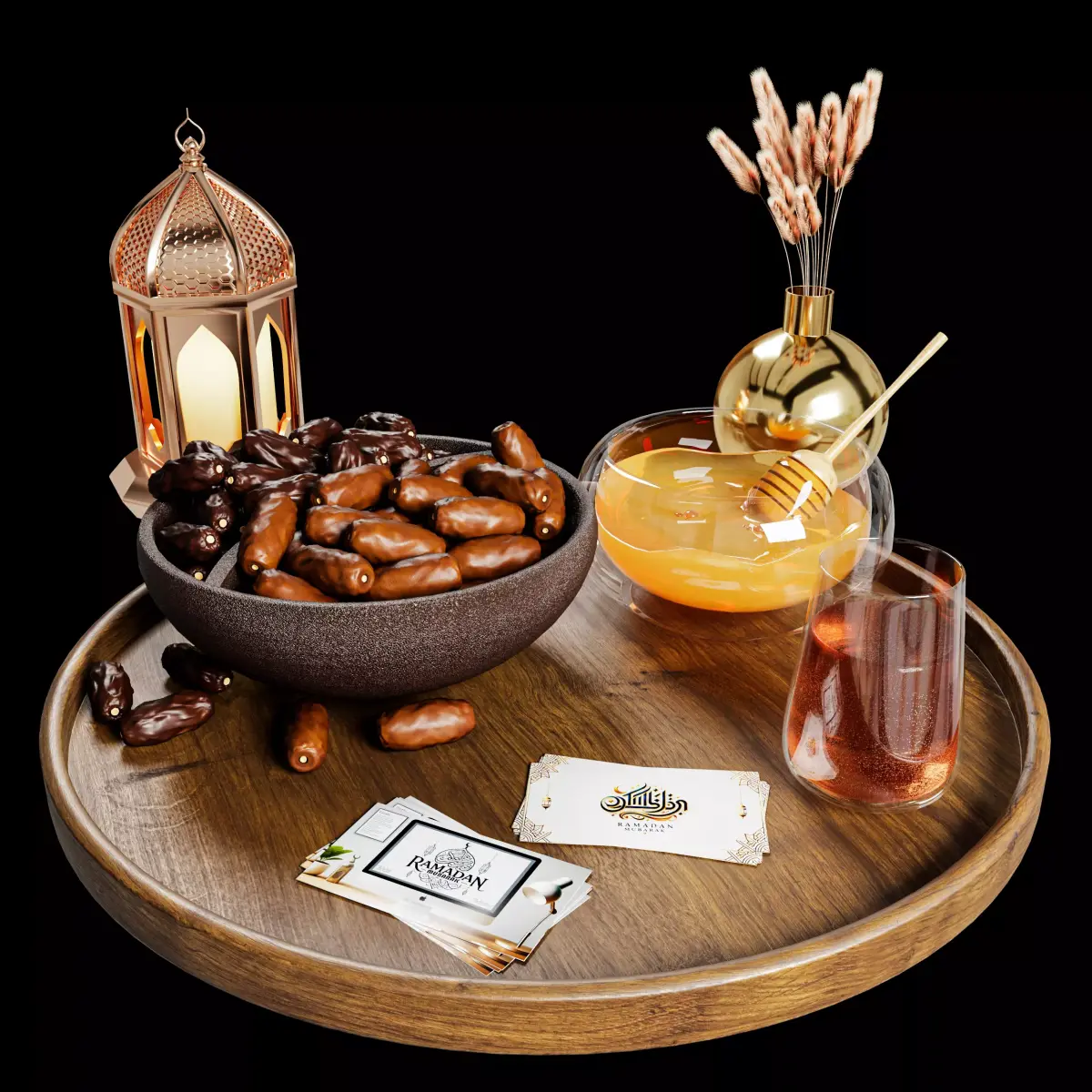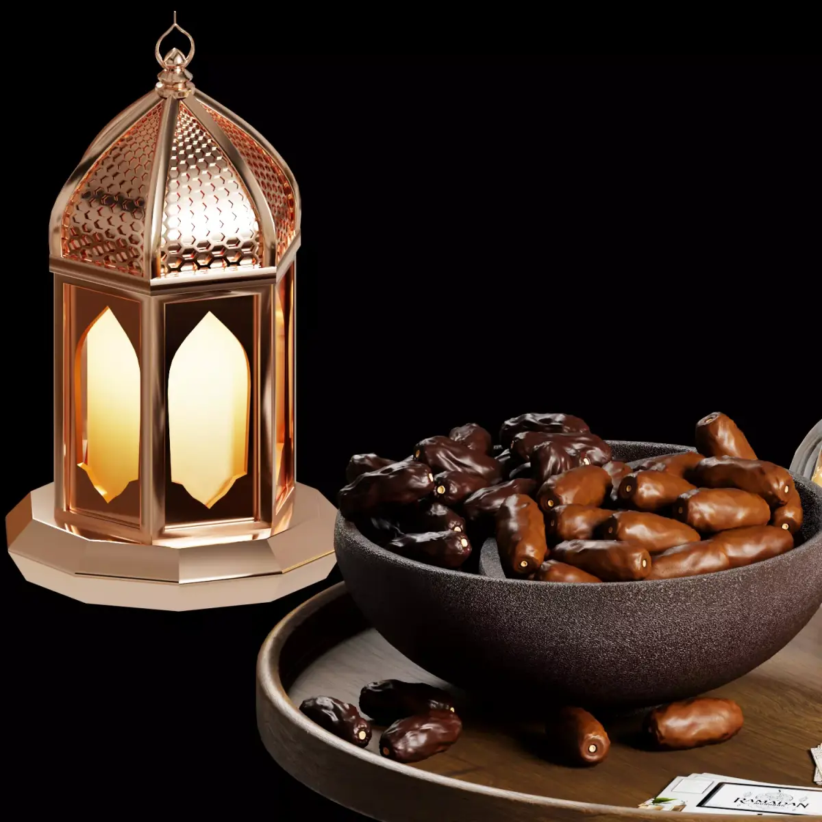 A carefully crafted Ramadan-themed 3D scene designed to create a warm and elegant iftar atmosphere. The composition includes a wooden serving tray filled with traditional elements such as dates, honey, tea, and a decorative lantern. Golden accents and realistic materials give the model a premium look suitable for close-up renders, advertising visuals, interior scenes, or festive Ramadan projects. Every object in the scene has been modeled with attention to small details such as reflections, glass thickness, food texture, and metal surfaces. The setup works well for product visualization, archviz decoration, social media renders, and seasonal promotional graphics. The lighting and materials were built to achieve a soft, realistic Ramadan mood, making the scene ready for high-quality renders with minimal setup.