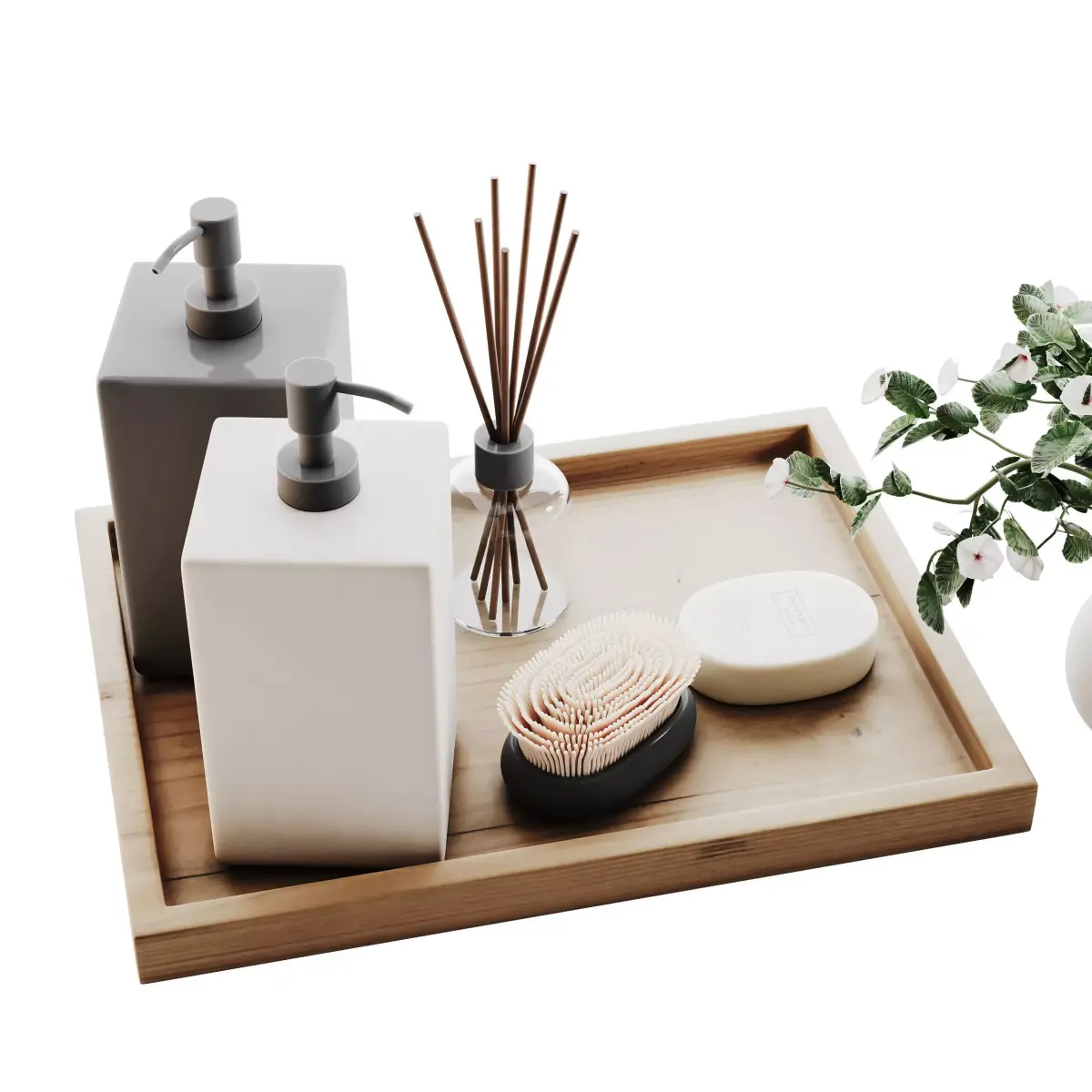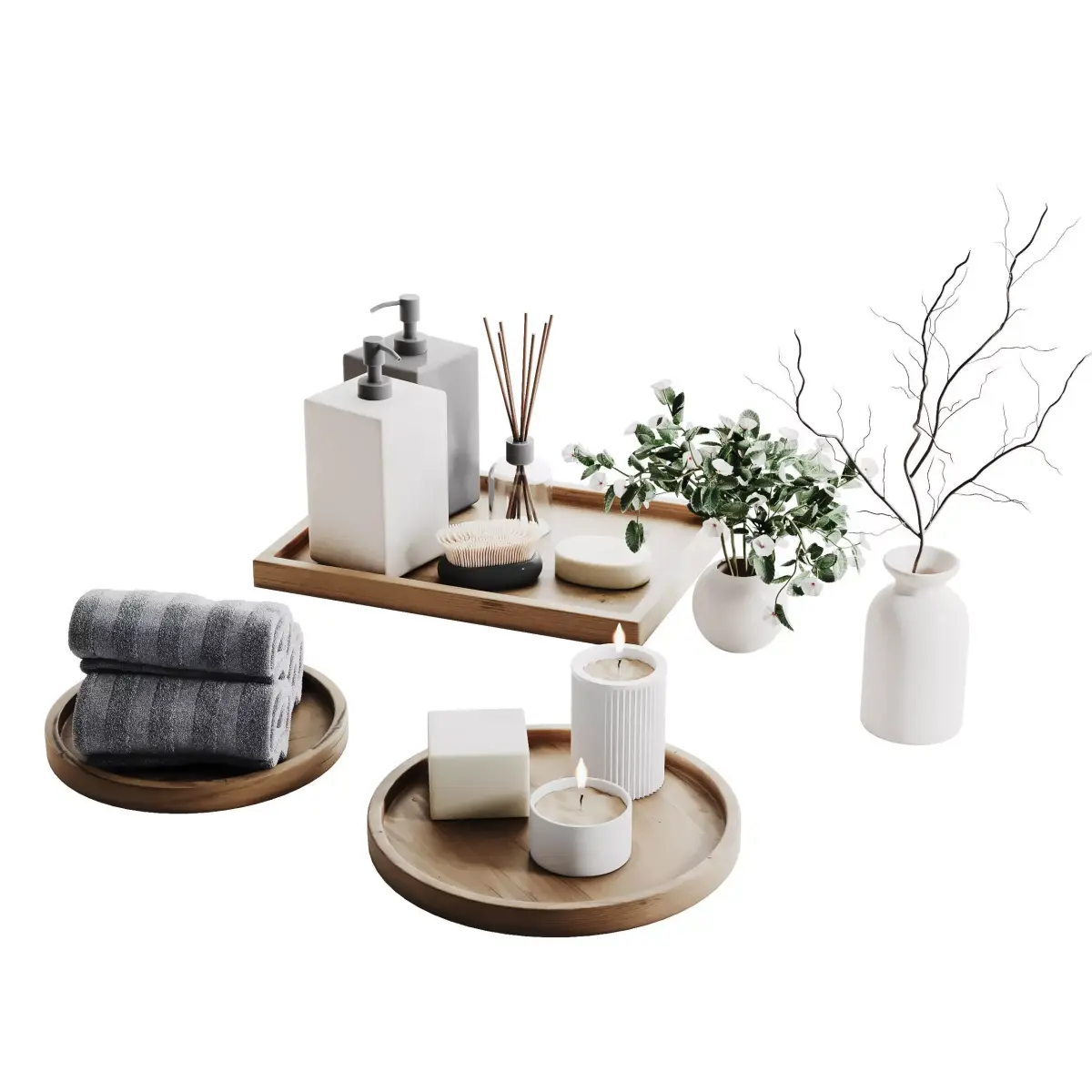 Name: Decorative Set 011Type: modelFormat: 3Ds Max 2016Export: FBX, OBJRender: Corona Renderer 10Polys: 148084Verts: 157075Units: MillimetersDimension: 885.65 x 919.65 x 486.29Description: A minimalist decorative set featuring modern bathroom and home accessories. The set includes soap dispensers, candles, rolled towels, wooden trays, and elegant ceramic vases with floral and branch arrangements. Designed in a clean neutral palette with natural wood accents, this model perfectly complements Scandinavian, contemporary, or spa-inspired interiors. Ideal for adding realism and detail to bathroom or vanity scene visualizations.Tags: decorative set, home decor, 3d accessories, corona render, minimalist design, interior decoration, bathroom decor, candles, towels, vases, wooden tray, ceramic vase, plant decor, realistic model, photorealistic render, spa accessories, modern design, scandinavian interior, bathroom scene, decor elements, corona materials