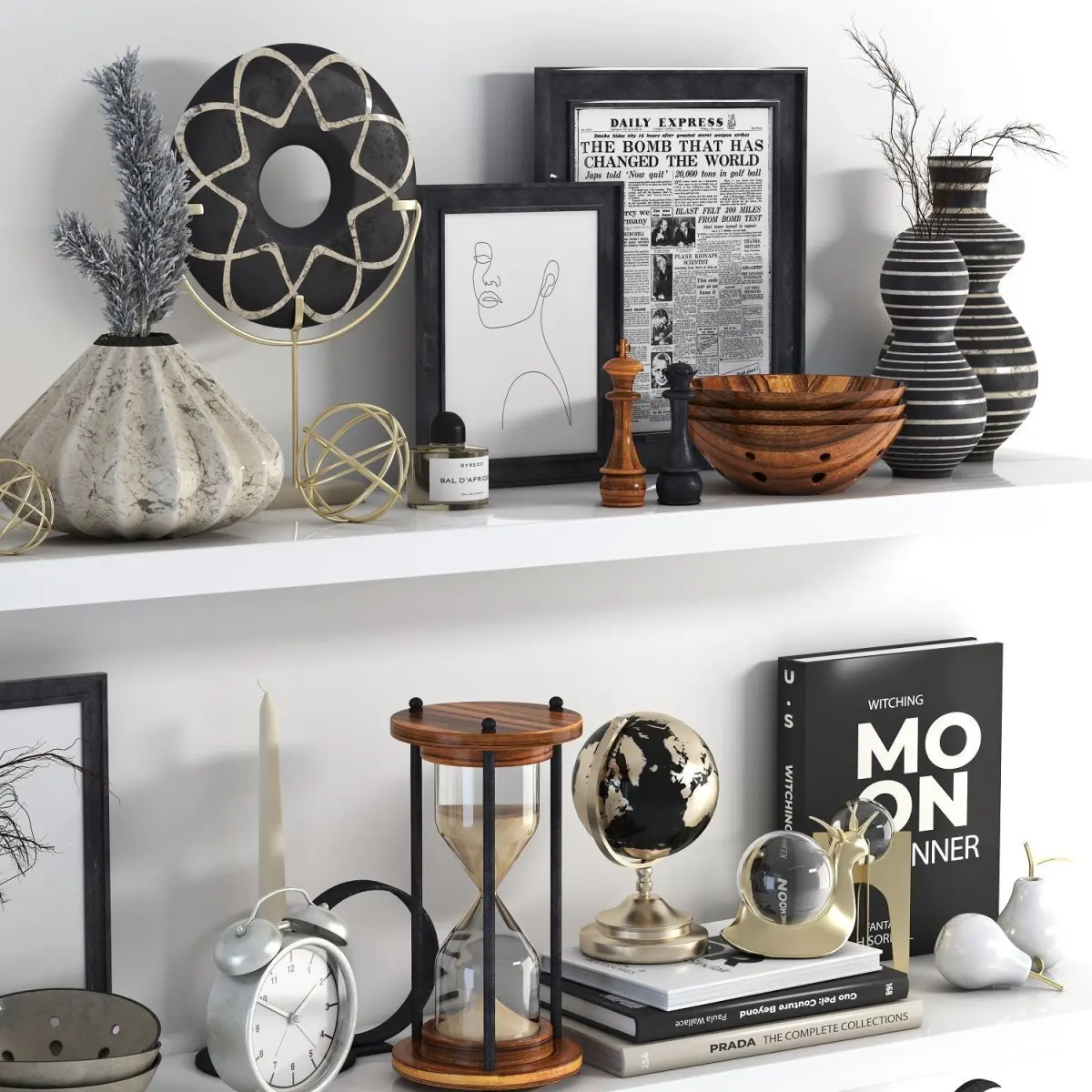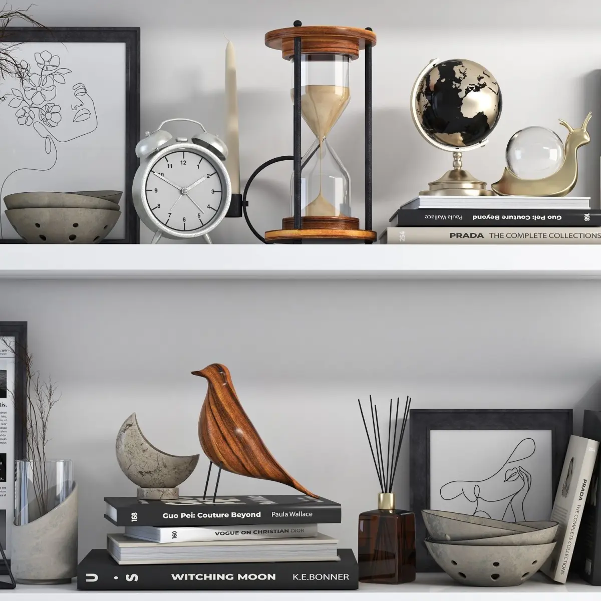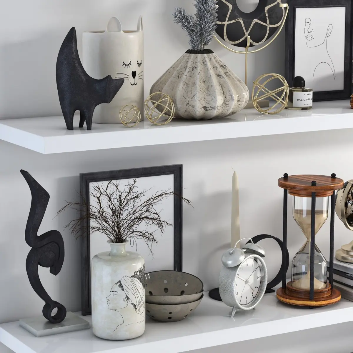 List of objects: vase , picture frame ,Cat sculpture , Chess, book , pear ,Earth, Candle ,Bowl ,watch ,Dry twigs ,Hourglass ,Sculpture ,perfume ,Bird