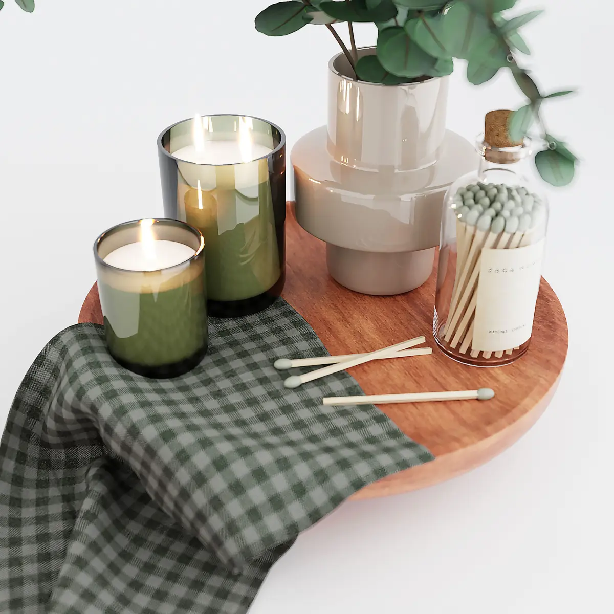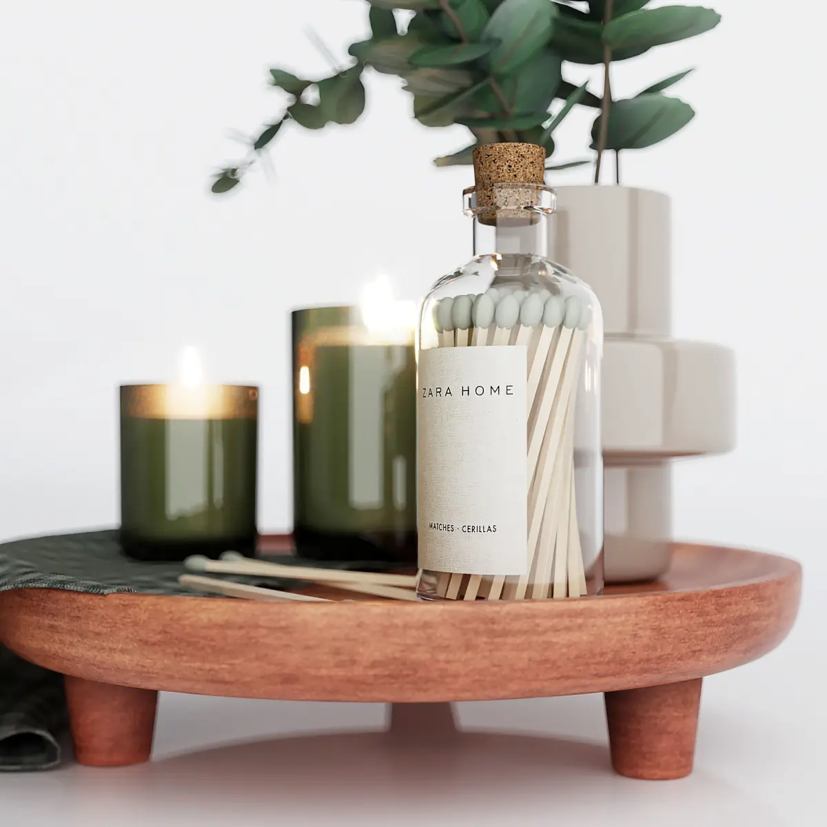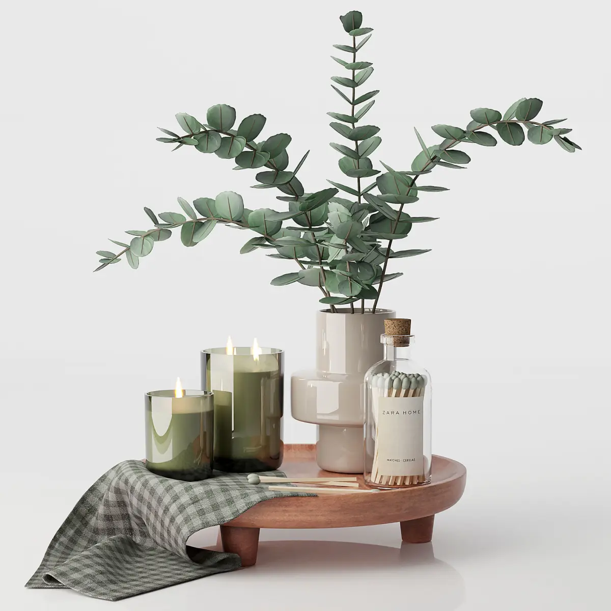 Objects in Scene: Beige Ceramic Vase / Eucalyptus Branches / Green Glass Candle Holders with Flame / Green Textured Fabric / Zara Home Matches Jar / Zara Home Wooden Tray