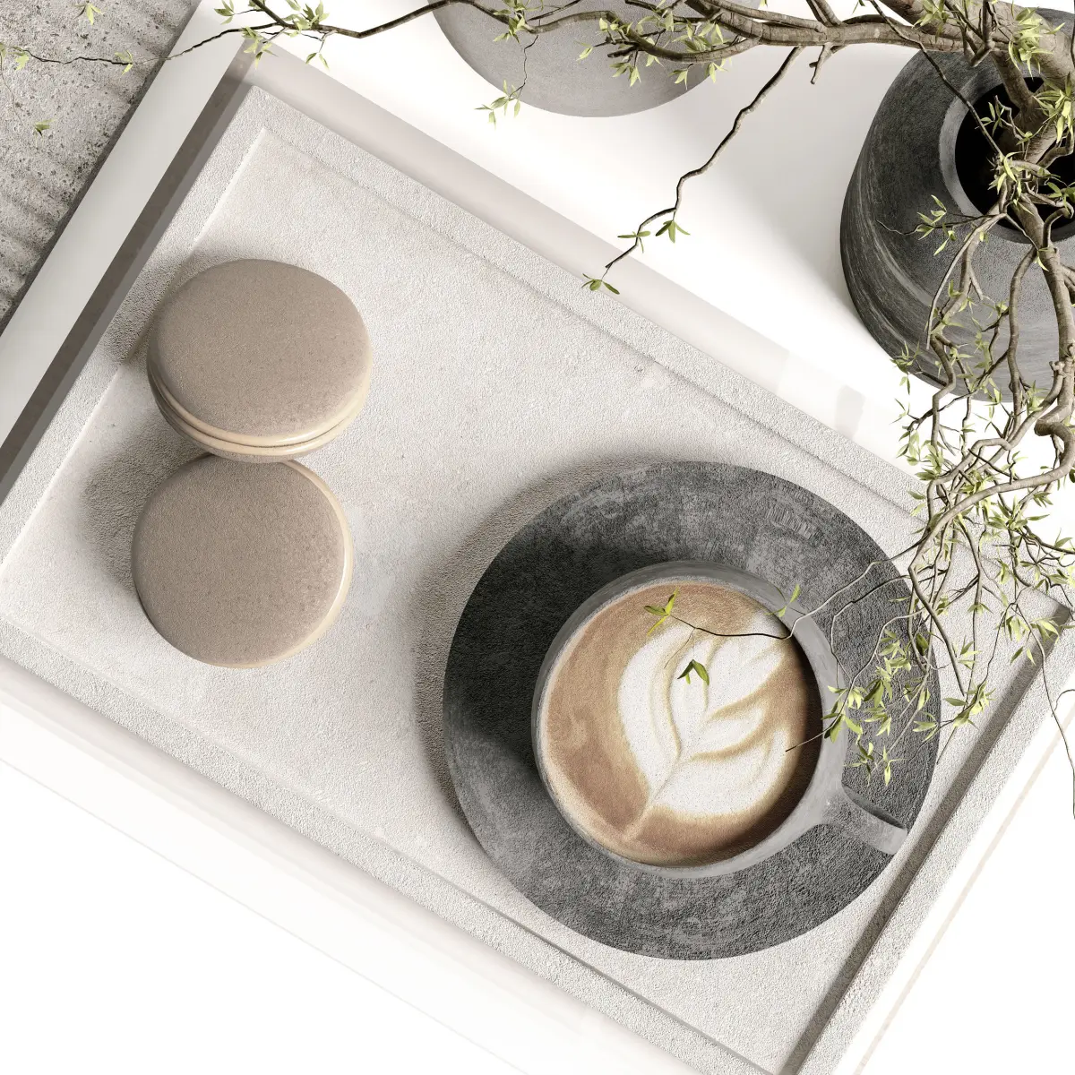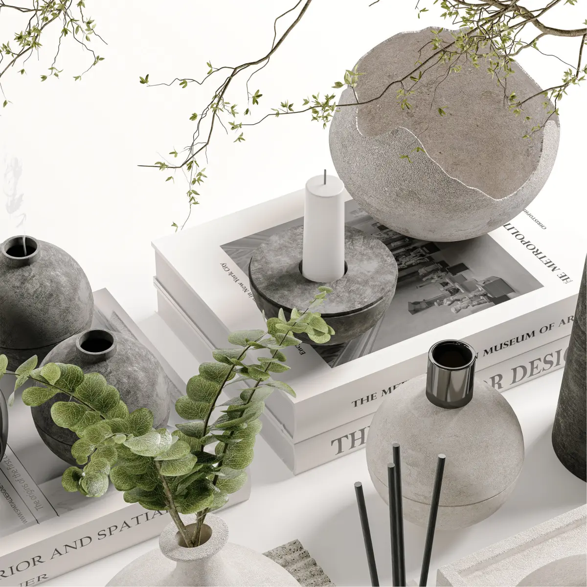 Decorative Set 09 include Books, Eucalyptus Plant, Candle Holder, Incense Burner, Macaron, Concrete Vase with plant, Black Knot Sculpture and other decorative Elements Used in Minimal, Modern, Scandinavian, Wabi Sabi, Moden Organic and Japandi Styles ...