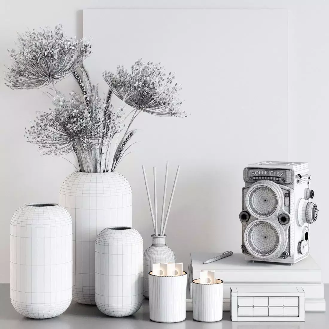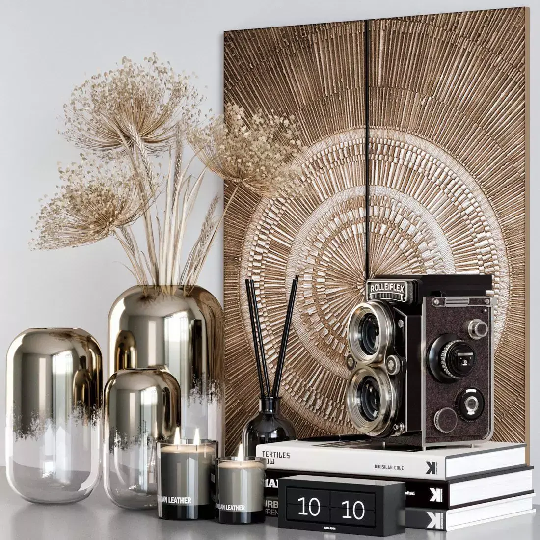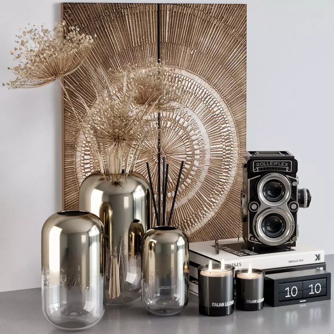 - candlesticks-picture-pen and pencil-clock-glasses-relief-camera