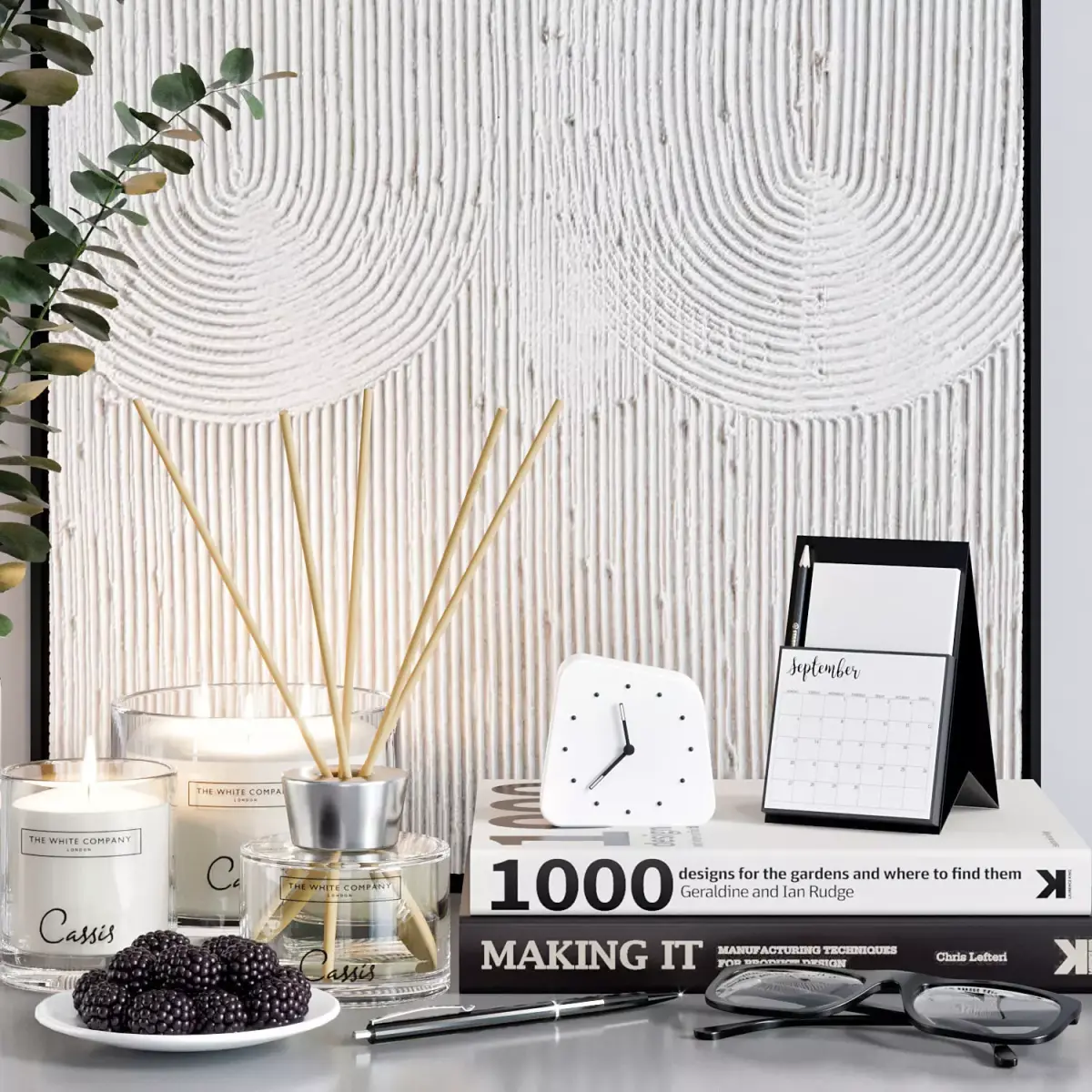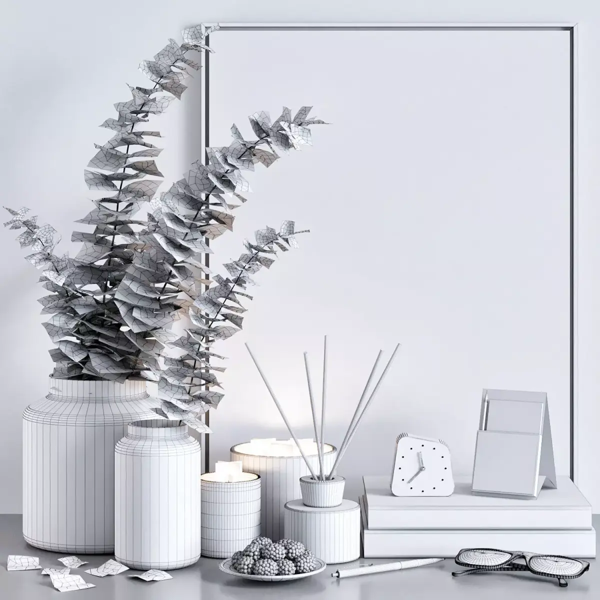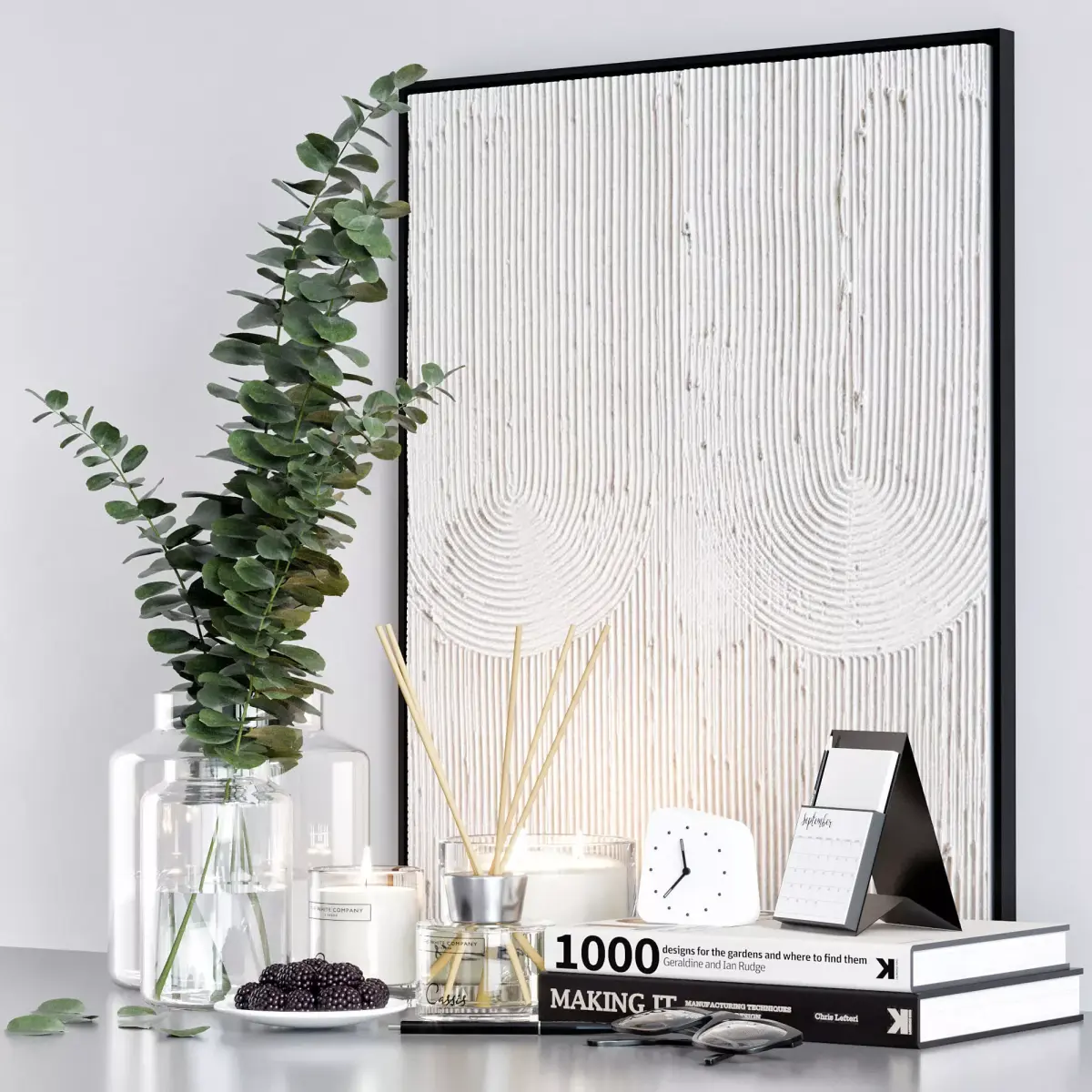 -grass in a vase-vases-books-candlesticks-pencil-pen-glasses-relief-clock-calender