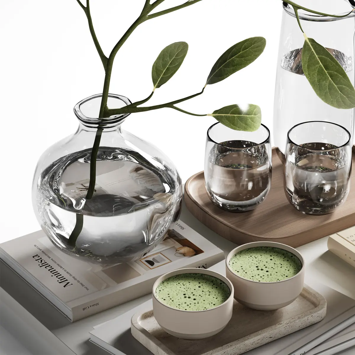 Decorative Set 20 include Vase with Plant ,Jug with glasses, Wooden Tray and books Used in Minimal, Modern, Wabisabi, Japandi and Moden Organic Styles ...
