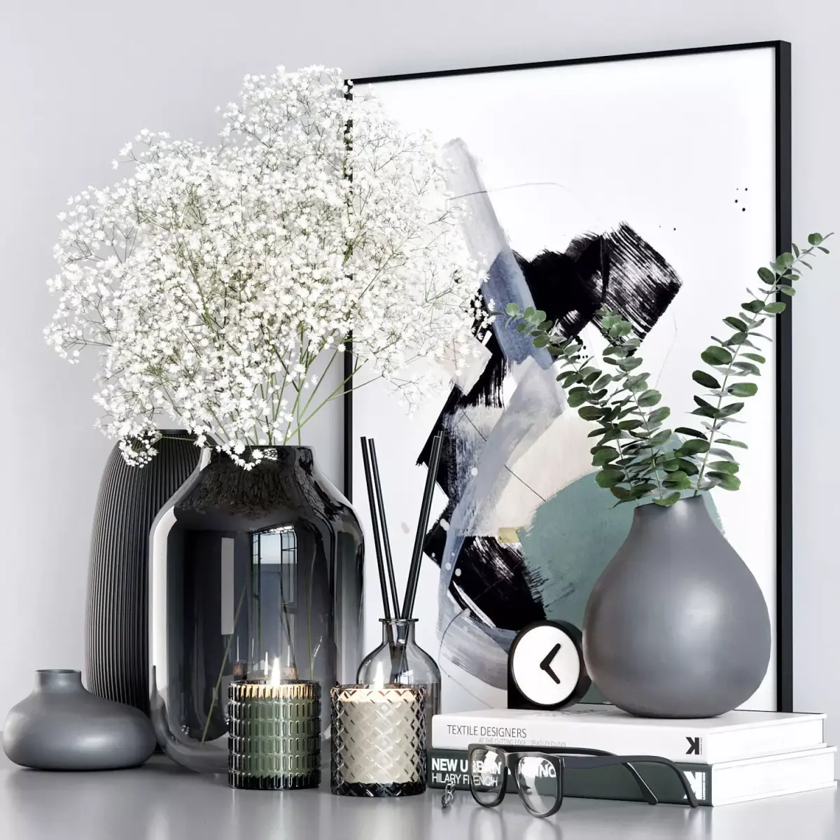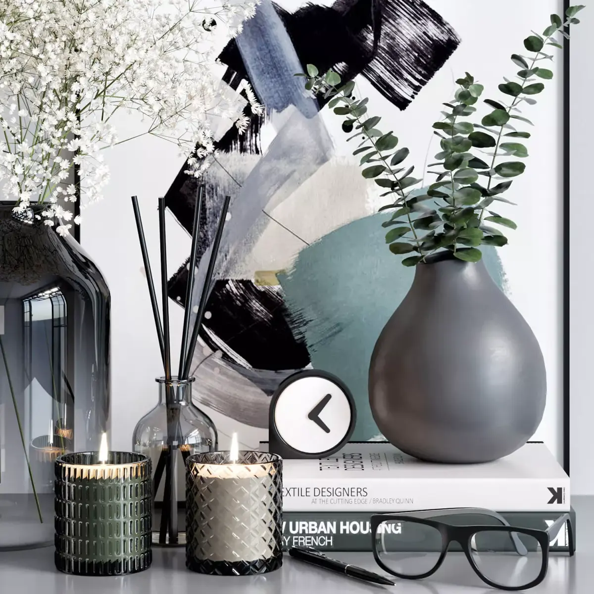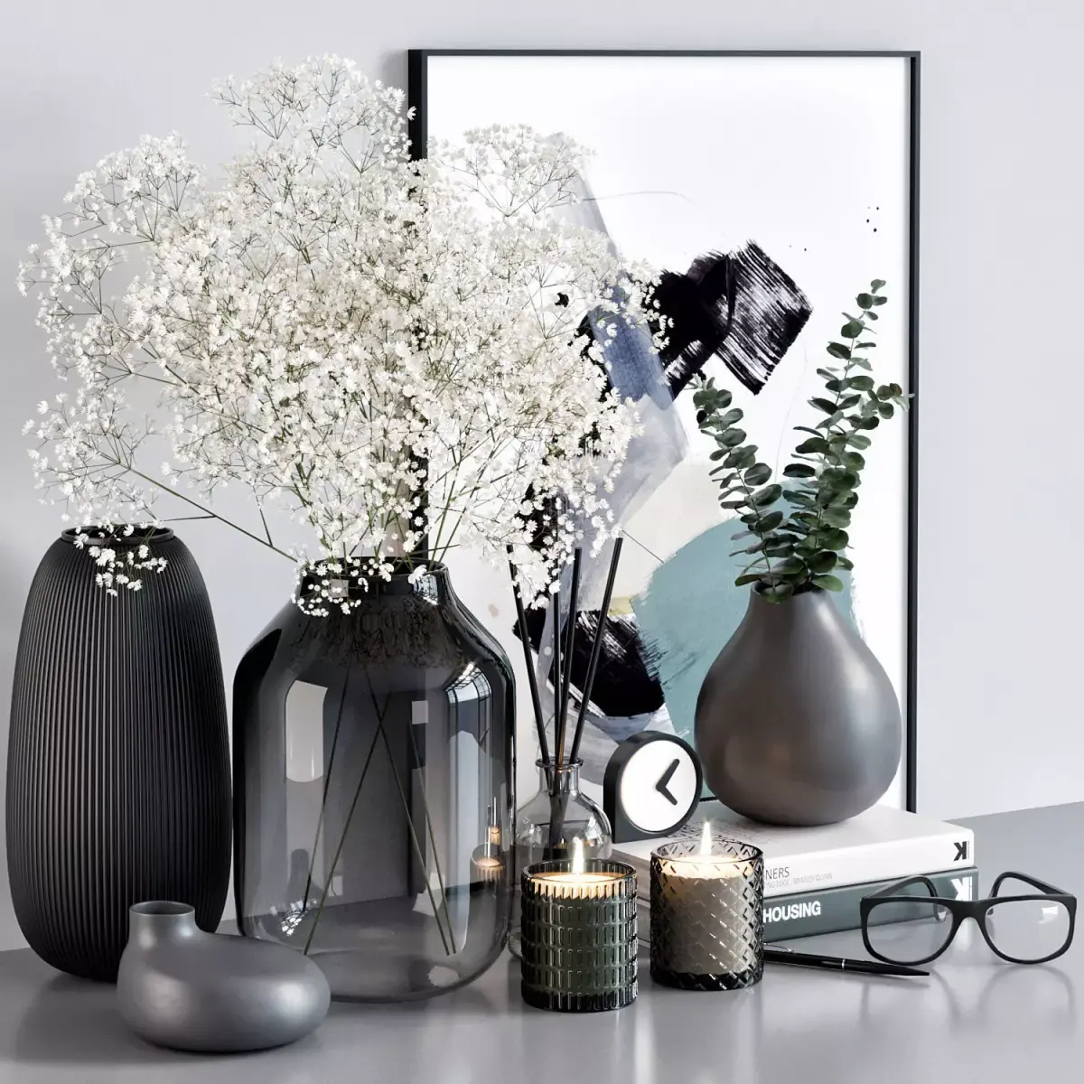 -flower in a vase-vases-books-candlesticks-pen-glasses-picture-clock