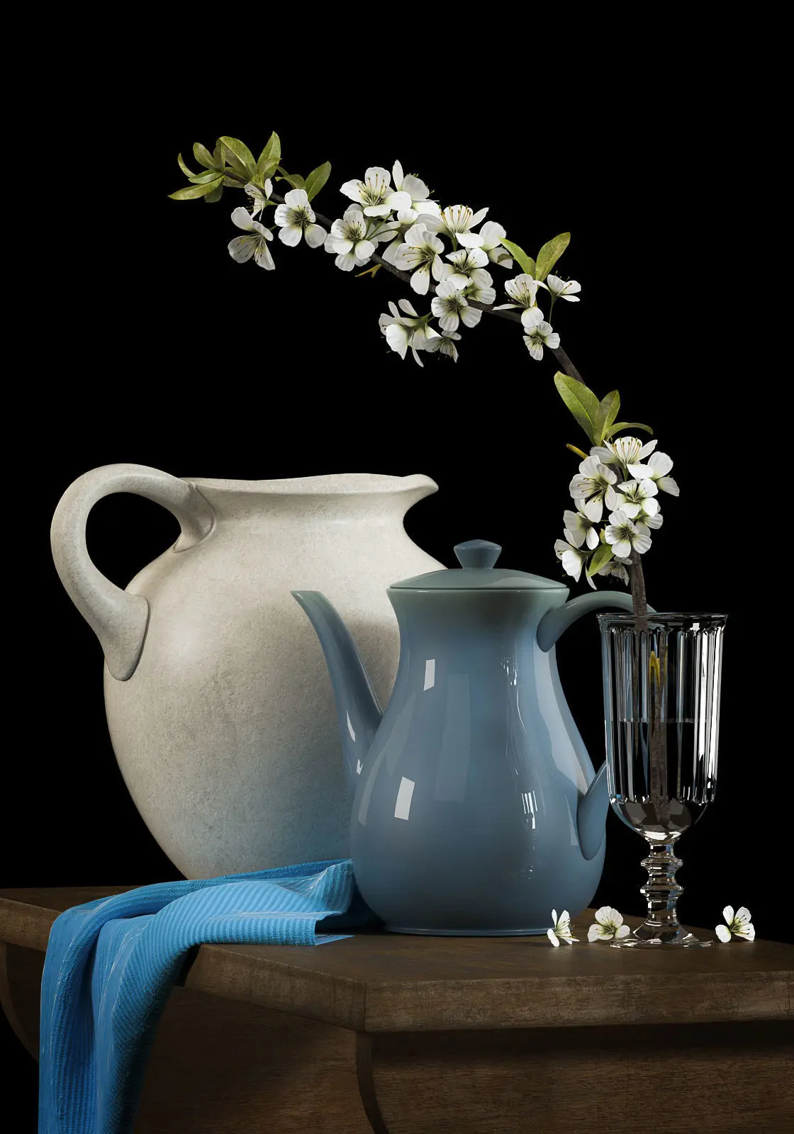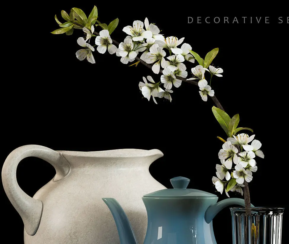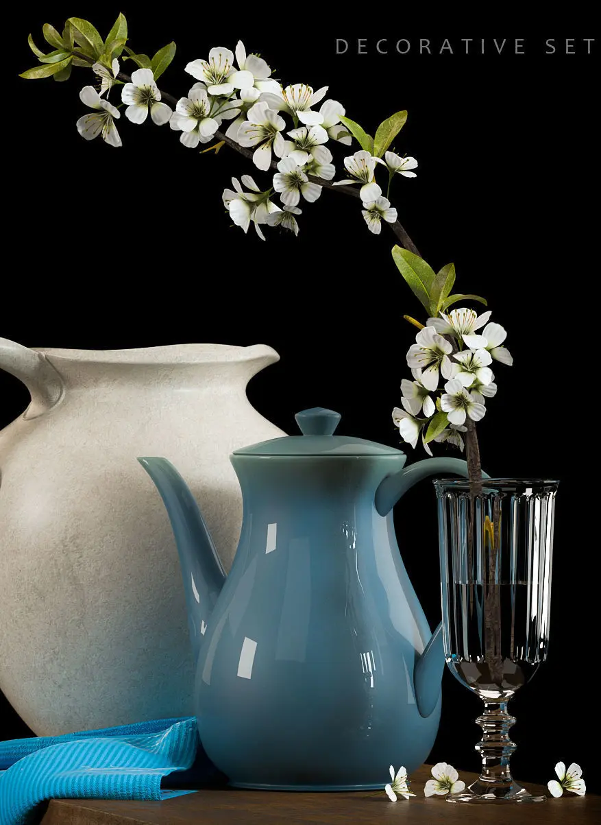 decorative set 26 contains a beautiful composition of still life with traditional mugs and spring flower bunch in a glass vase.. look very elegant with your interiors.. created in 3dsmax, plug ins are used