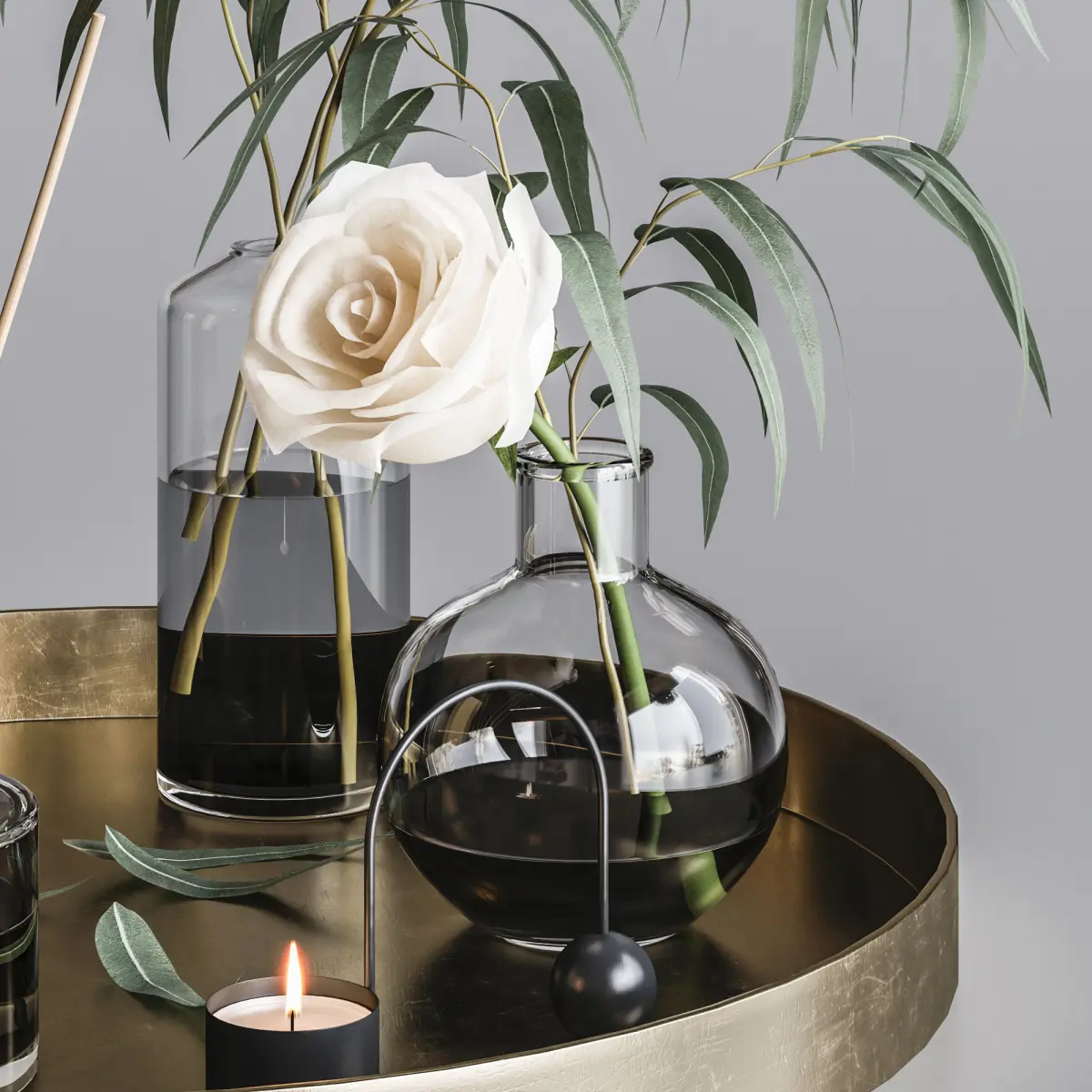 Decorative set with a rose and eucalyptus.