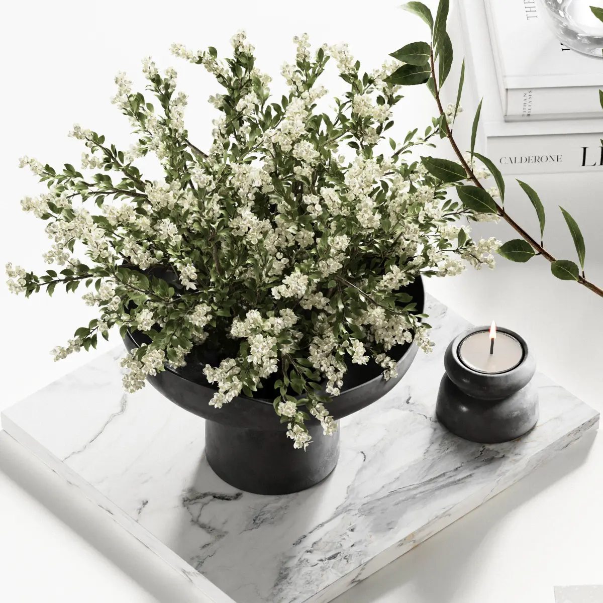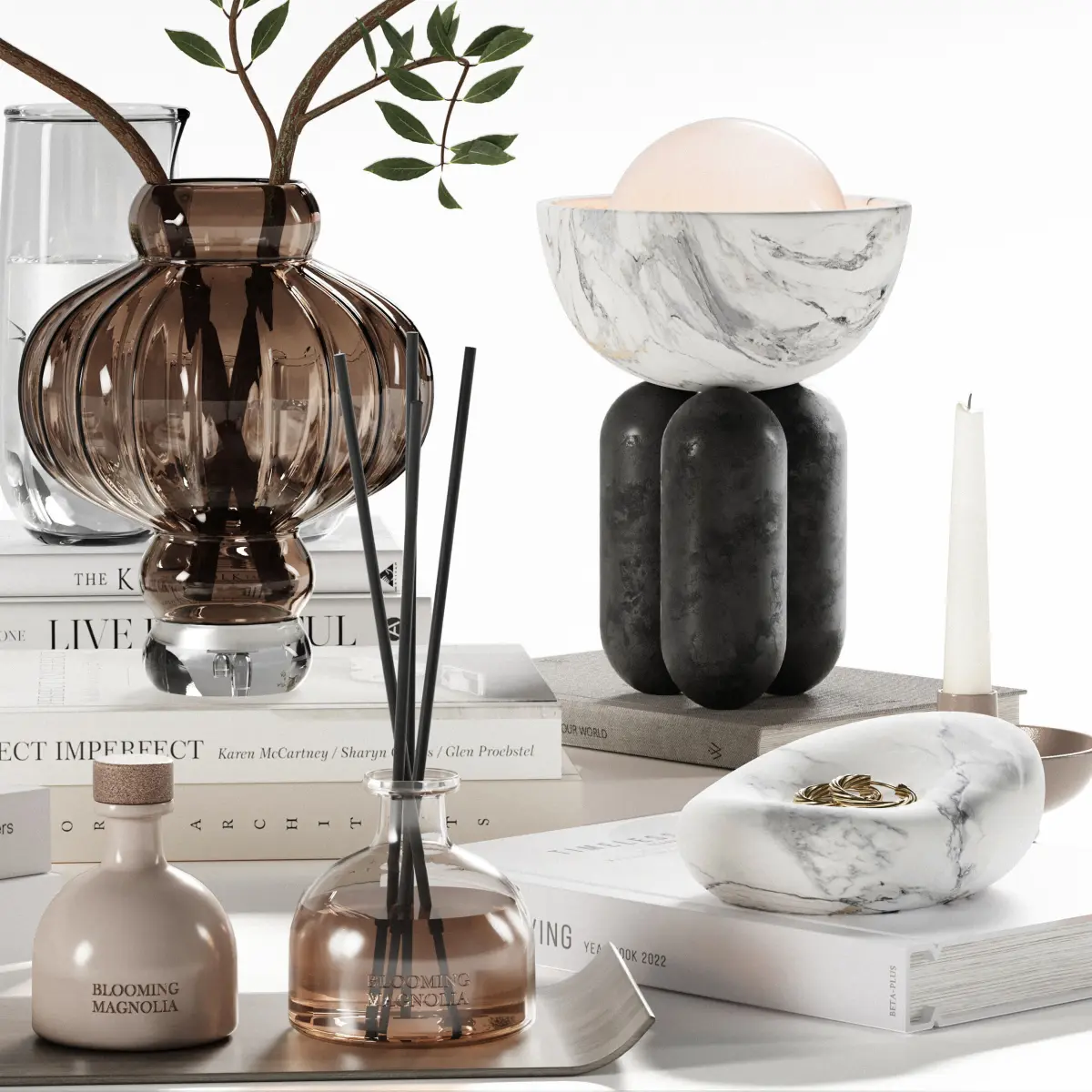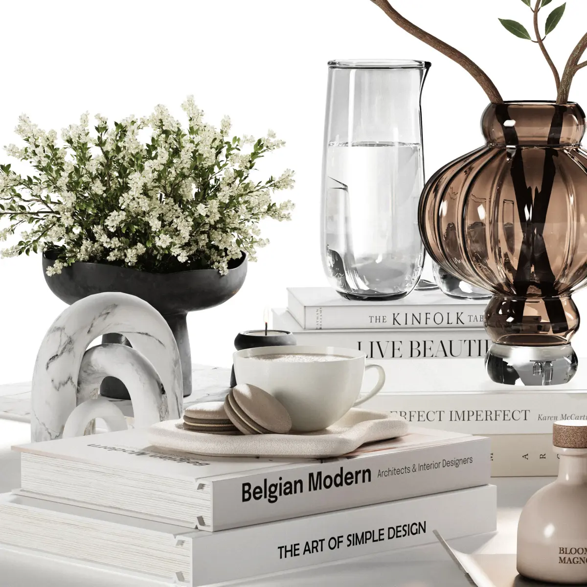 Decorative Set 37 include Concrete Vase with Flowers, Glass vase with Branch, Books, Jug and glass, Latte and macaron and Other Decorative Items Used in Minimal, Modern, Wabisabi, Japandi and Modern Organic Styles ...