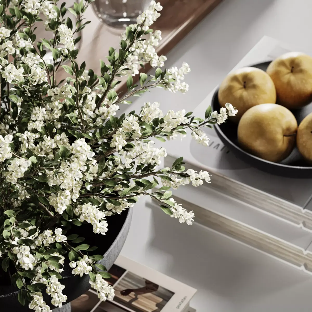 Decorative Set 40 include Plaster Vase with White Flowers, Books, Jug and Glass, Yellow Apples and Other Decorative Items Used in Minimal, Modern and Modern Organic Styles ...