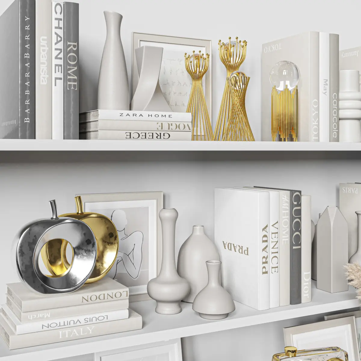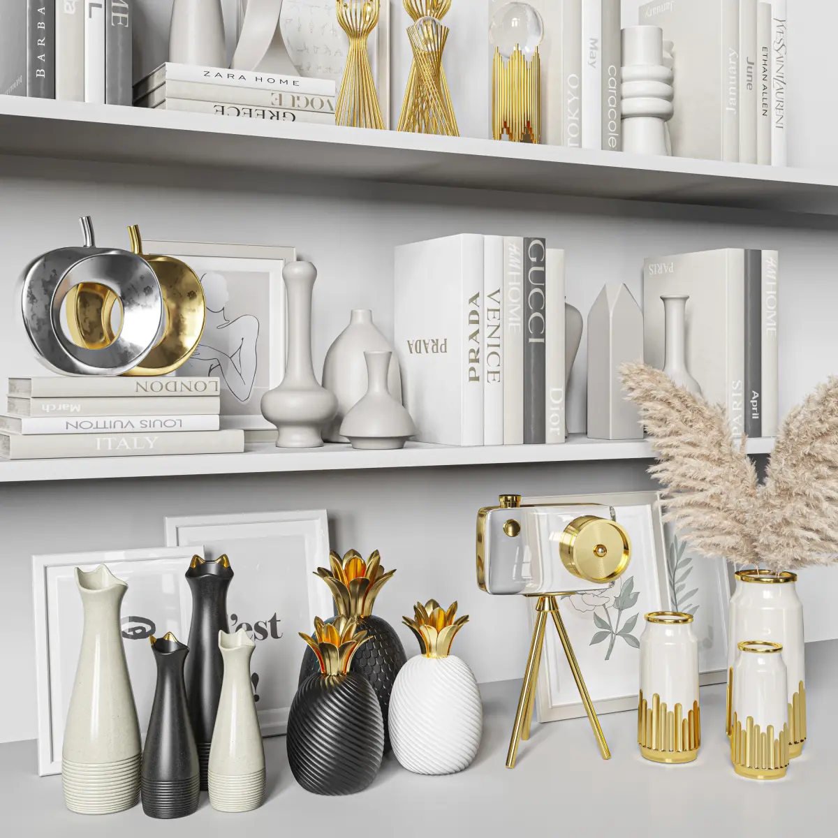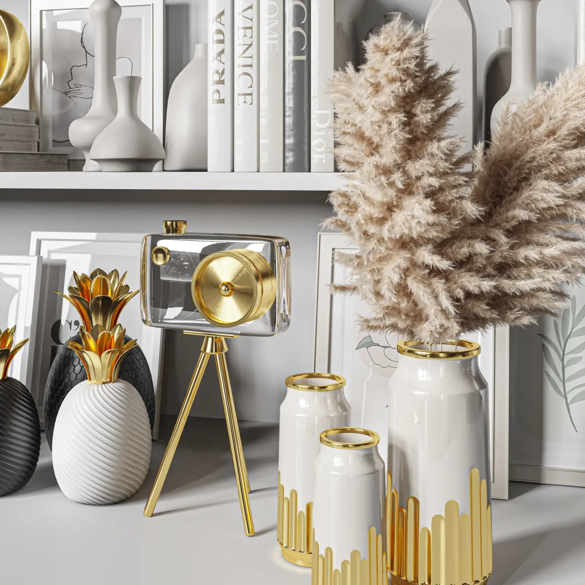 vase, decor, decoration, set, book, candle, frame, picture, cotton, pampas, apple, pineapple, gold, camera, glass, brass, fashion,