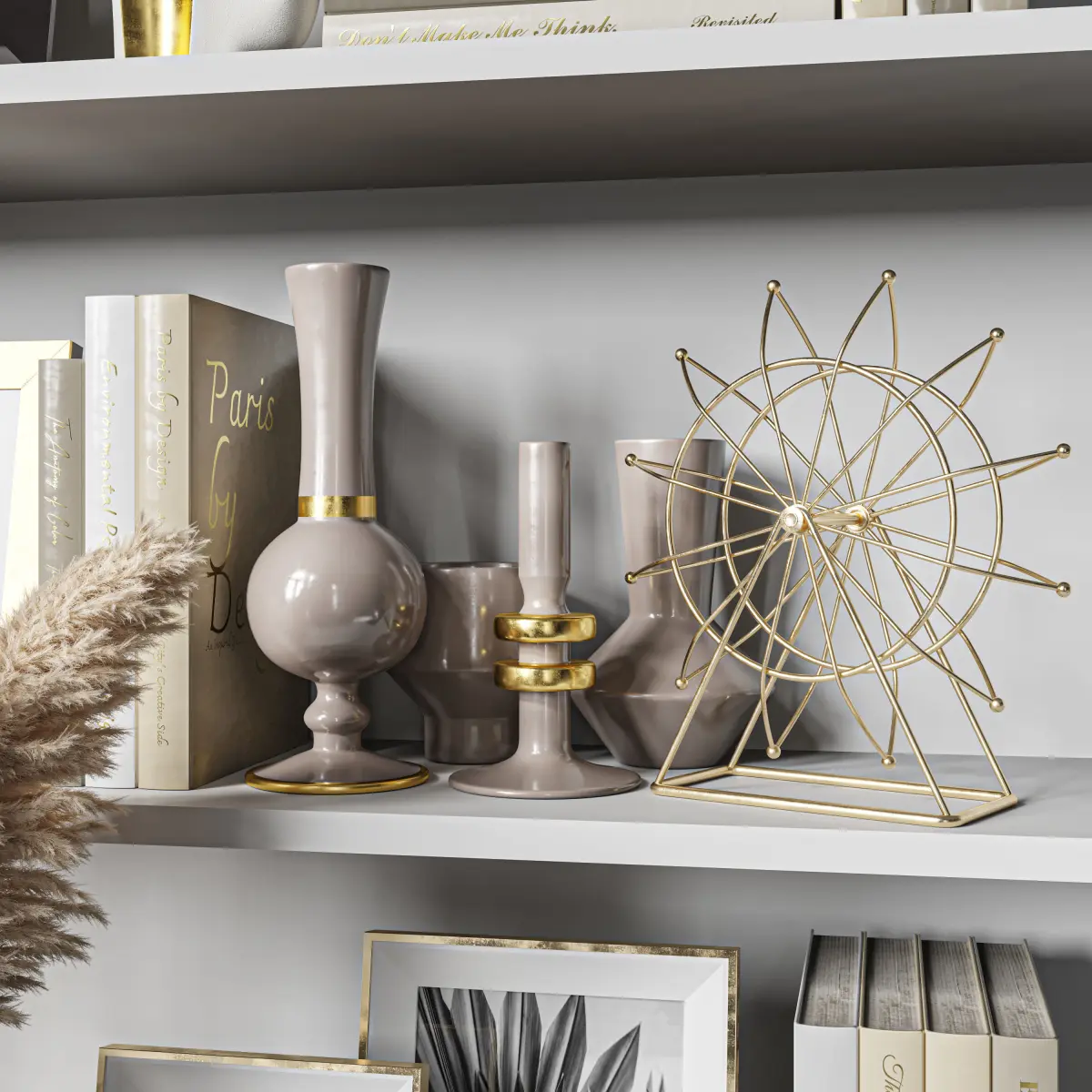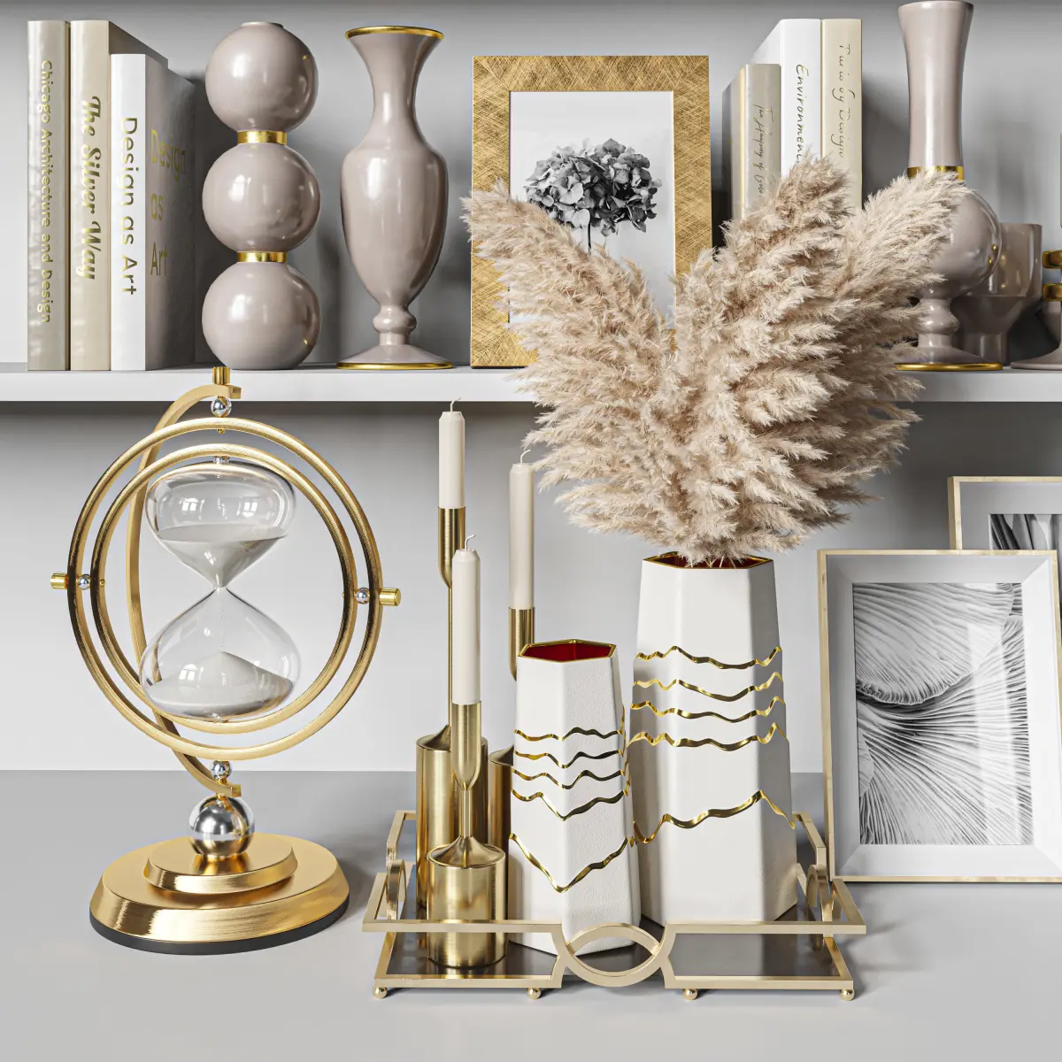 vase, decor, decoration, set, book, candle, frame, picture, glass, brass, fashion, hourglass, pampas, wheel, ferris, sculpture,