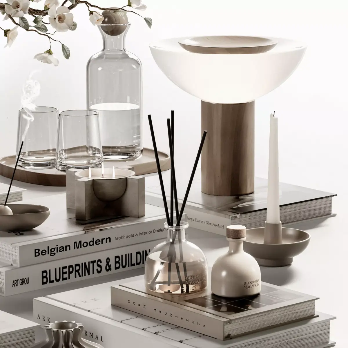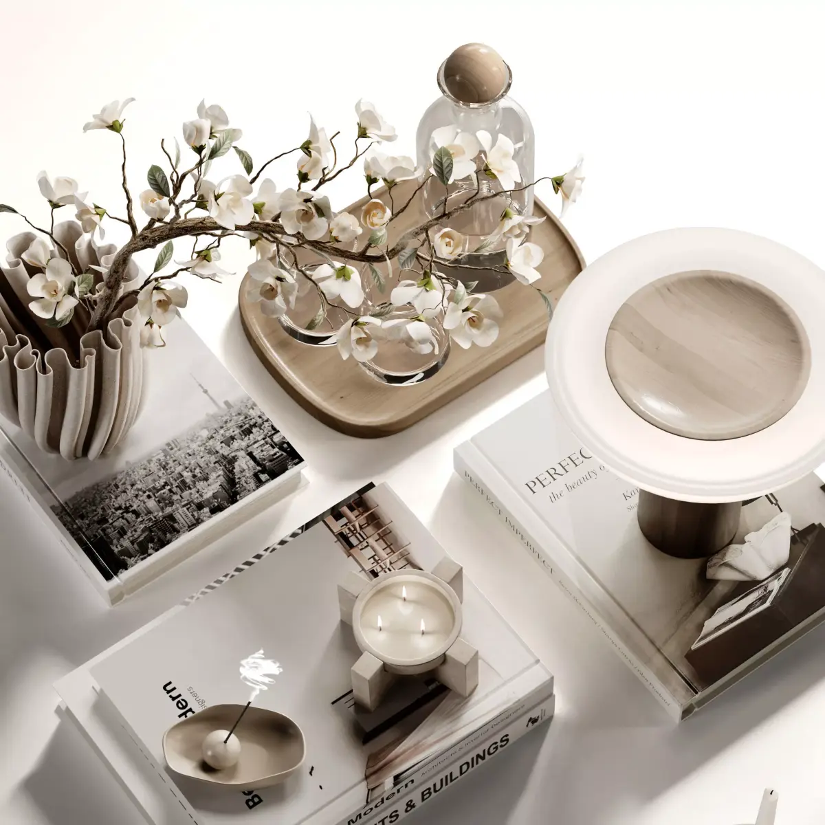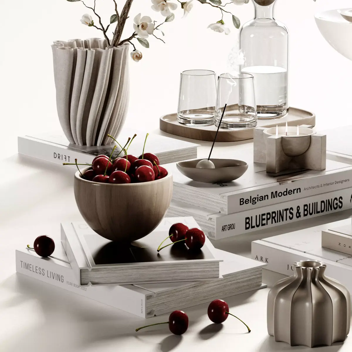 Decorative Set 44 include Plaster Vase with White Flowers, Books, Jug and Glass, Bowl of cherries, Table Lamp and Other Decorative Items Used in Minimal, Modern and Modern Organic Styles ...