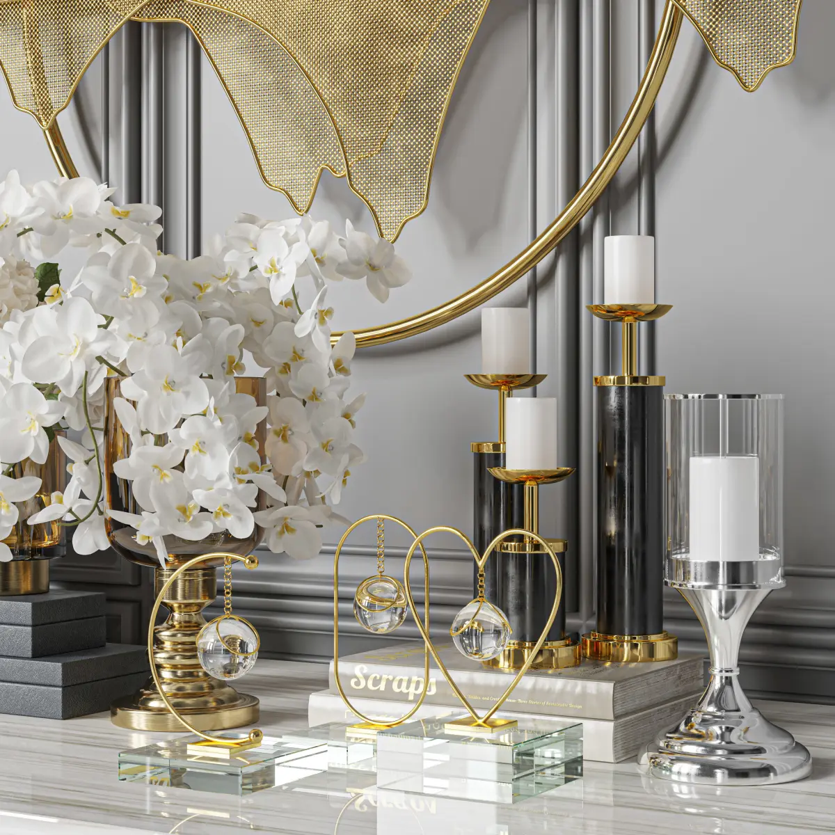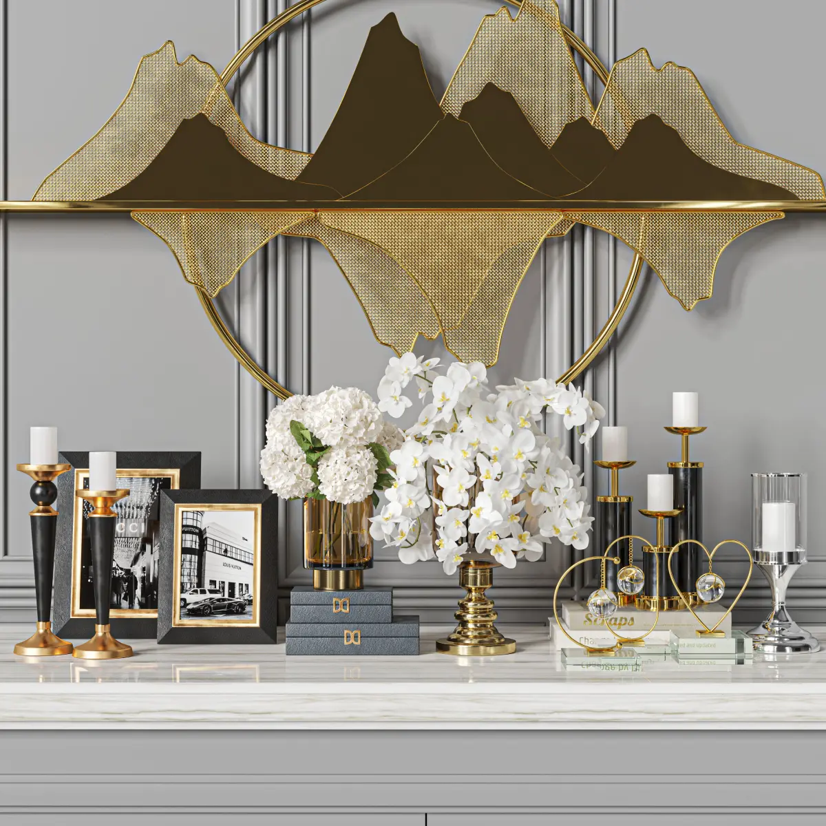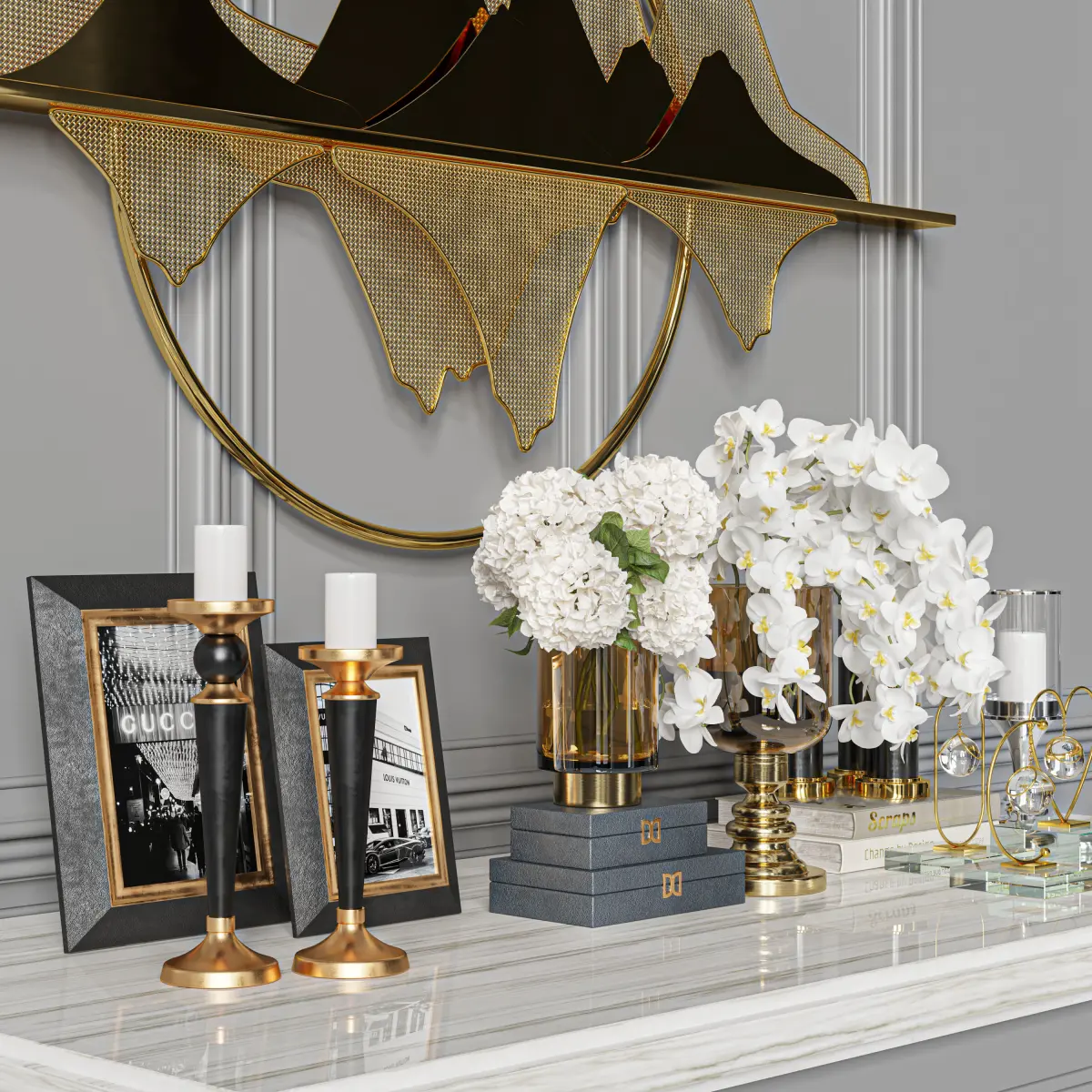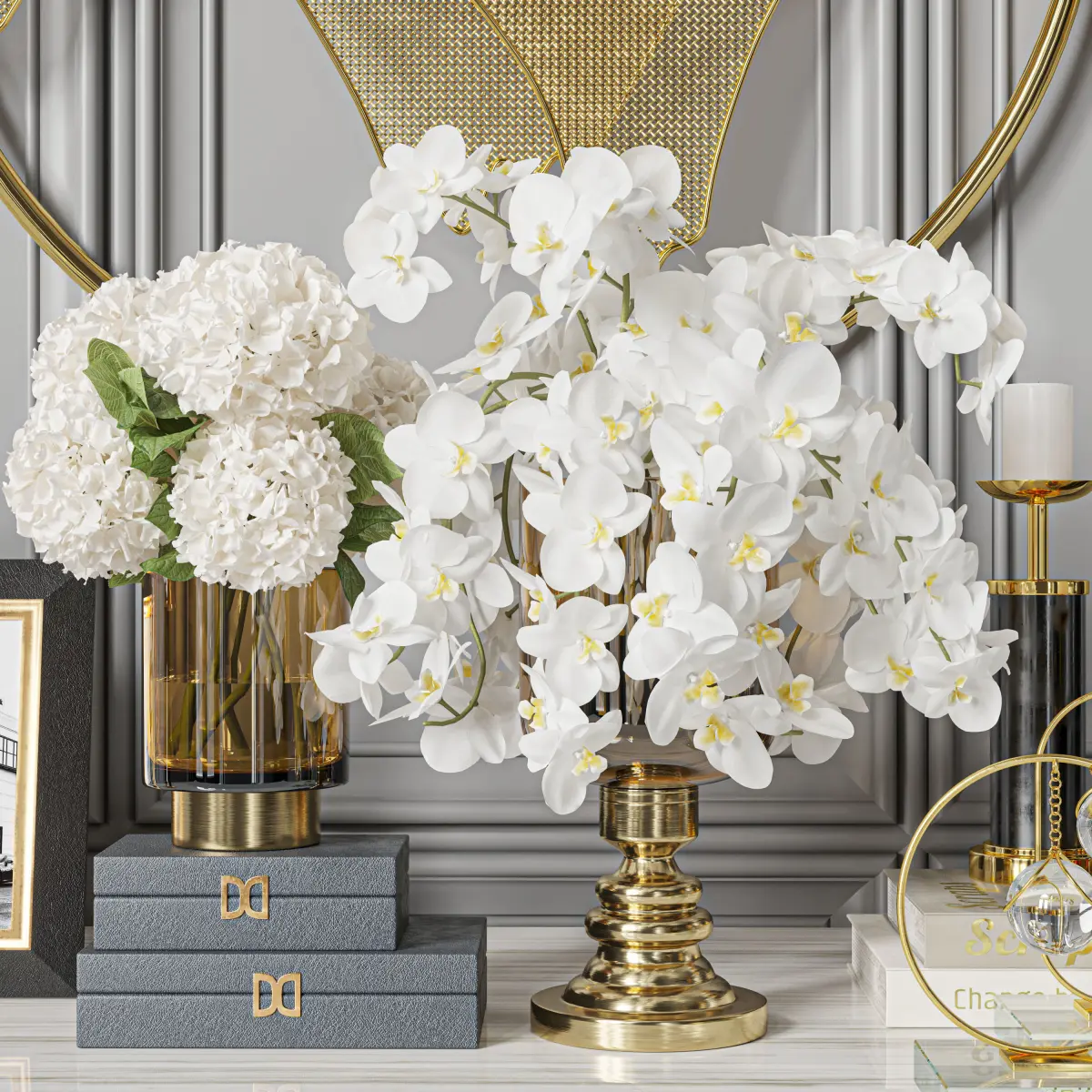 vase, decor, decoration, set, book, candle, frame, picture, glass, brass, fashion, sculpture, hydrangea, orchid, flower, bouquet, heart, love, wall, ornament, pulse, mountain,