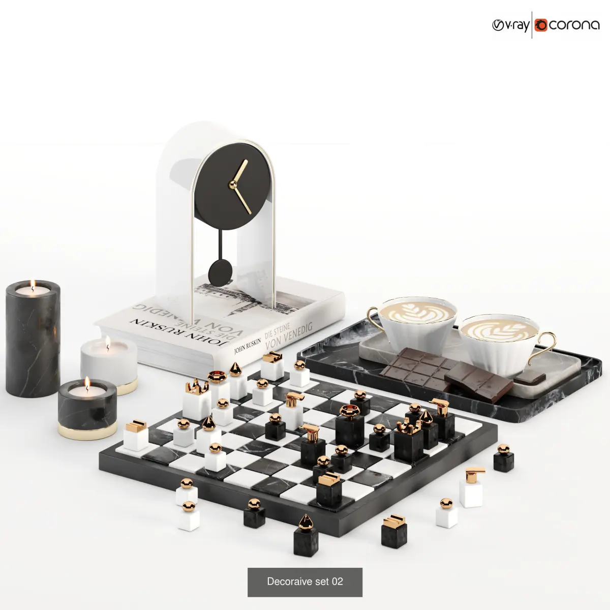 this collection contains of two table decorative set one, lamp light and beads, book and photo frame, aroma stick, and the second one table decor borad game, chess, cup of latte coffee and chocolate in a marble tray