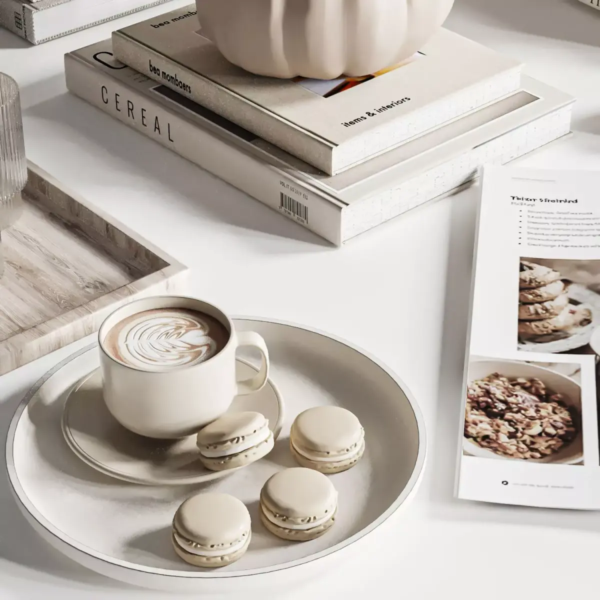 -Ceramic tableware with coffee cup, macarons, and pears