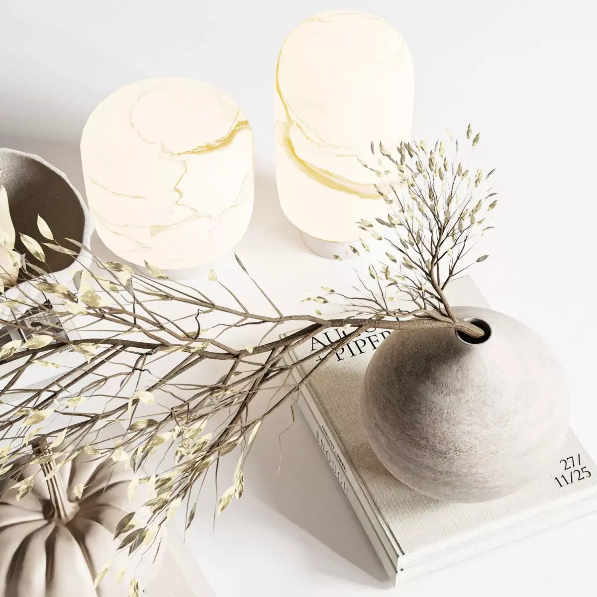 -Combination of books, ceramic vase, and dry autumn branches
