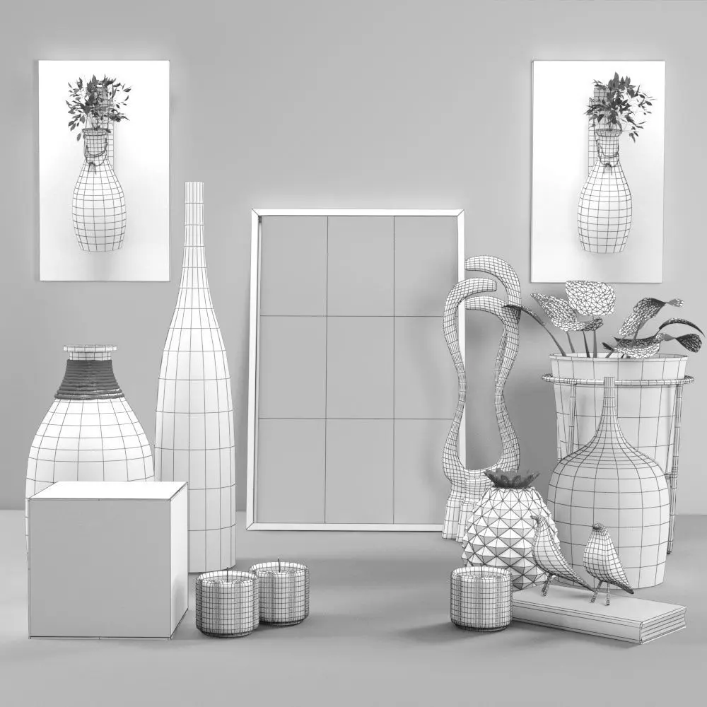 The design of the decorative set includes: plants, decor utensils, photo frames, bird sculptures.All objects are unwrapTextures and materials are PBR or vray Materials
