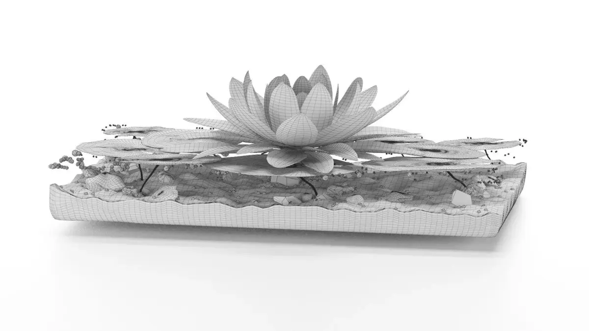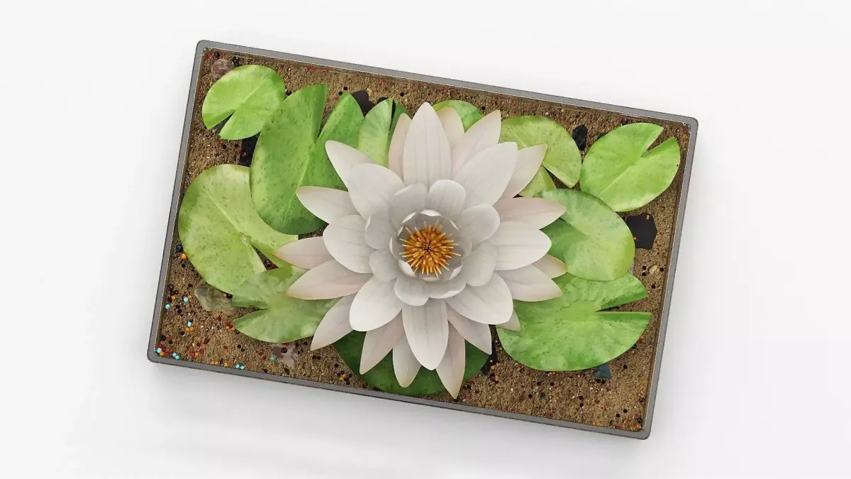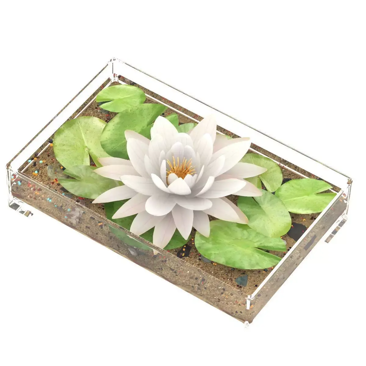 Water Lily white (Nymphaea Alba) in a glass vase with sand and pebbles.