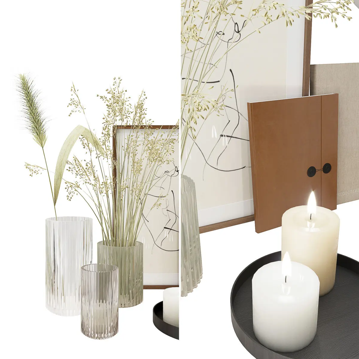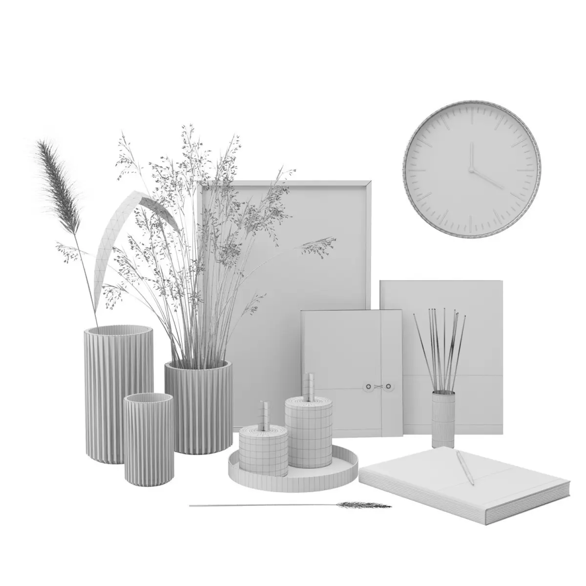 Models: - green grass - glass vases -candles - fabric books - frame - concrete clock - leather notebook - black pencil -wood plate