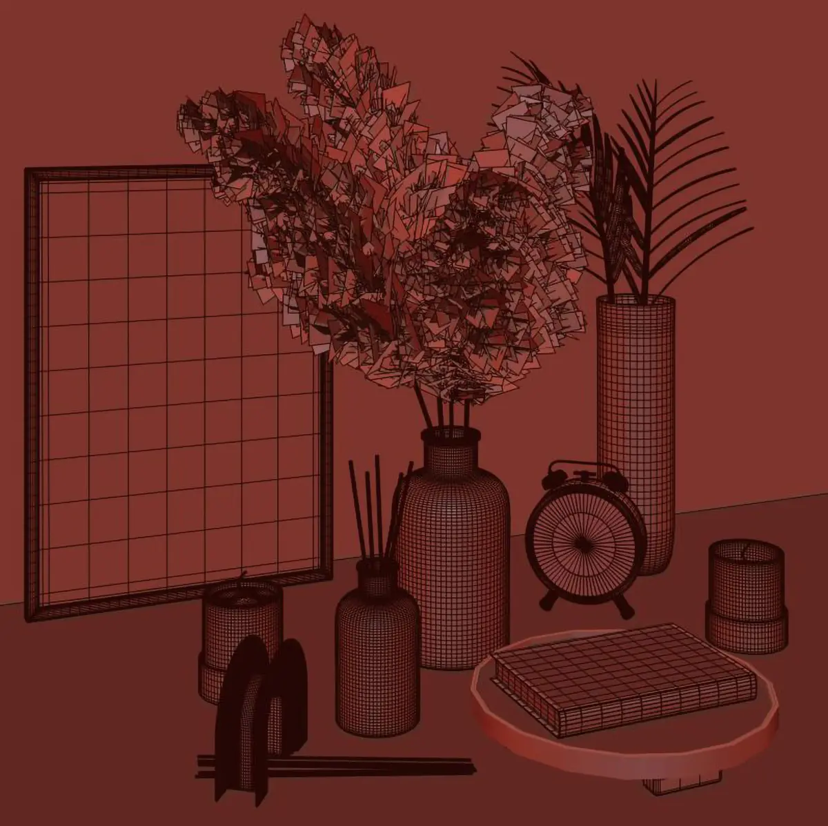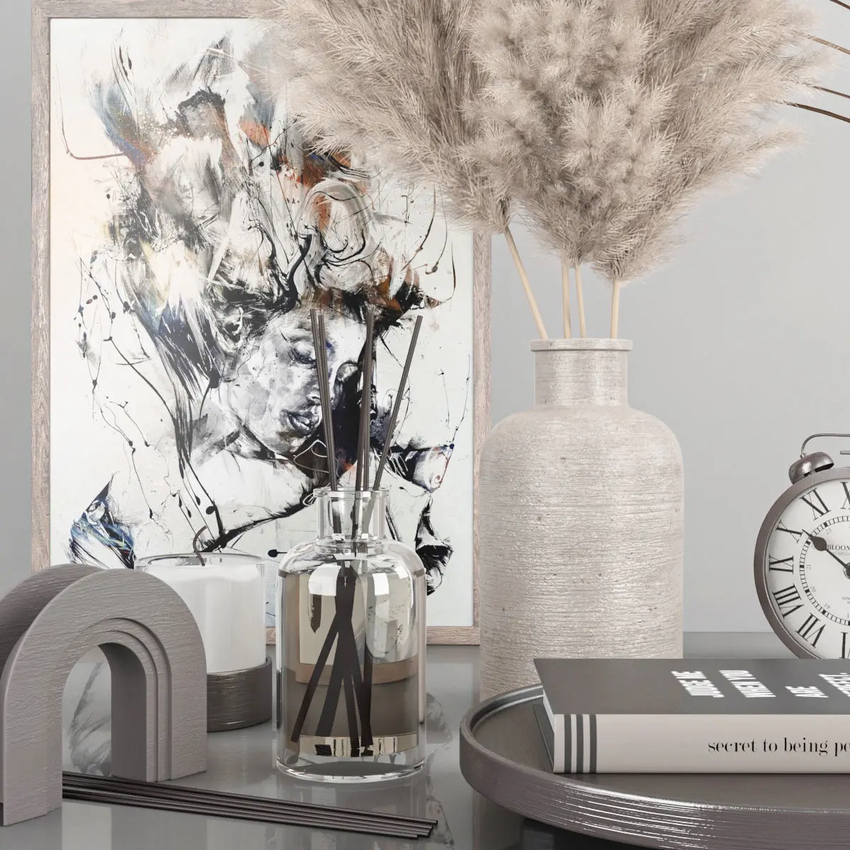 2 dry flower which are dry palm and dry pampas ,there are two vases. The vases has same material ,diffuser in glass bottle ,metal alarm clock ,wall picture ,tray and book ,2 candle with glass candle holder