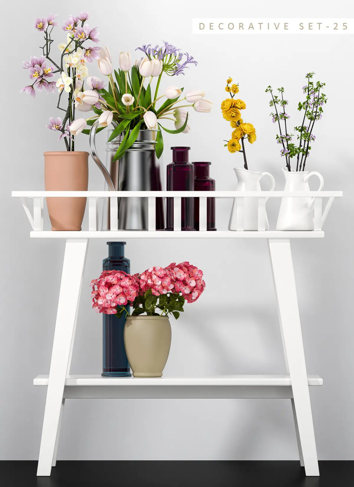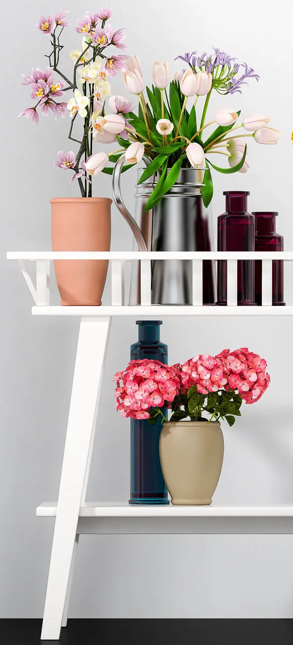 decorative flower vase set for different variety of flower bunches like tulip, orchid, lily, button roses, hydrangea and many more are beautifully arranged different types of pots and vases.. suits best for your interiors...completely designed in 3dsmax and no plugins are used